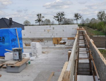 Budowę dachu zaczęliśmy od przygotowania elementów betonowych– miejsc podparcia pod konstrukcję, ścianek kolankowych. Wymaga to współpracy oraz dogadania dwóch ekip- murarskiej oraz ciesielskiej. Najlepiej, żeby ekipa ciesielska i dekarska to była ta sama firma lub bezpośrednio ze sobą współpracujące, ograniczy to możliwość błędów oraz ewentualnego zwalania winy jeden na drugiego. Murarze zalewając górne wieńce pamiętali o umieszczeniu w betonie specjalnych szpilek do montażu murłaty (czyli pierwszej belki opartej na murze) w rozstawie co 1m. Ściany szczytowe oraz komin należy wyprowadzić na mniej więcej połowę wysokości.