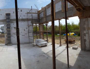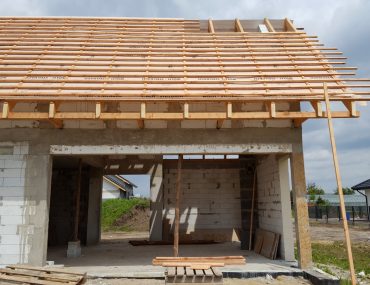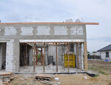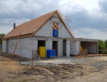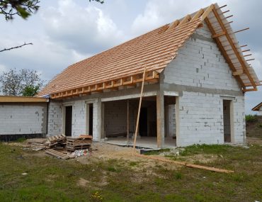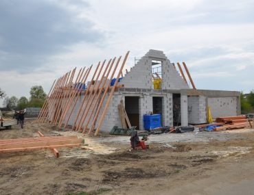 W tym momencie cieśle mogą rozpocząć konstrukcję dachu, zaczynając od montażu murłat oraz obróbki elementów konstrukcyjnych- krokwi, jętek, zastrzałów. W naszym przypadku elementy poprzeczne będą widoczne dlatego przed montażem chcieliśmy, by drewno było ostrugane. Docelowo będą jeszcze pomalowane olejem. Konstrukcja więźby zajęła 4 dni, następnie dokończono komin oraz ściany szczytowe, zalano wieńce i wyciągnięto wszystkie ścianki na poddaszu. W drugim rzucie zamknięto dach membraną dachową oraz pokryto łatami i kontrłatami.