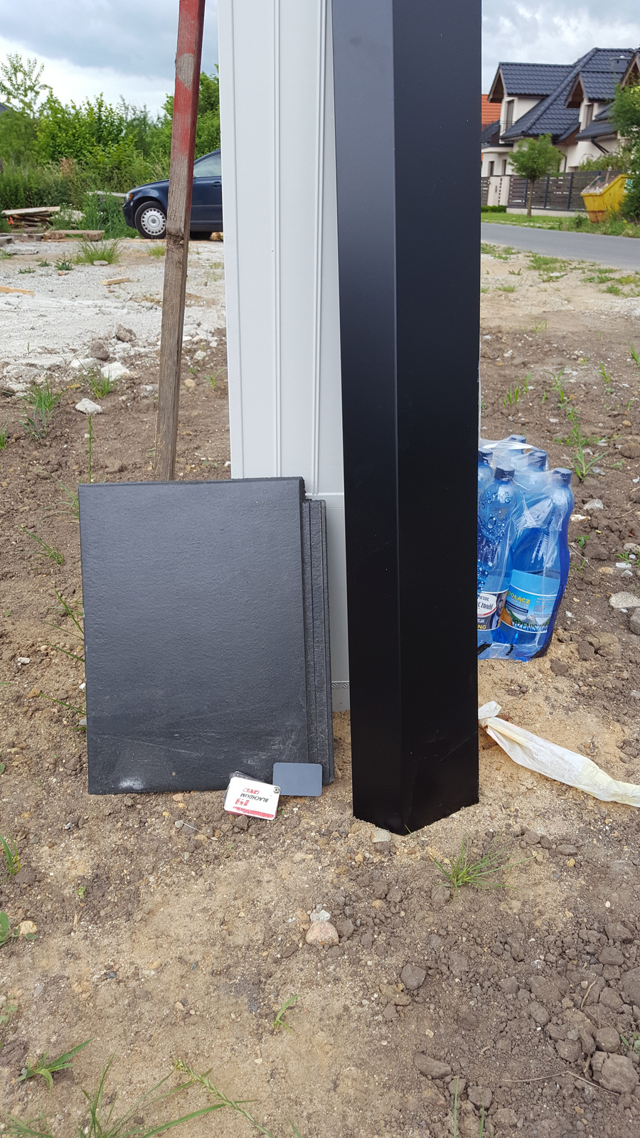 Żeby nie było tak pięknie, zamówiona blacha na obróbki okazała się czarna, a nie taka jaką zamawialiśmy- grafitowa. Nieważne, że przygotowana już była kilka tygodni wcześniej, nikt tego nie zauważył! Dopiero gdy cieśle wygięli arkusze pod obróbkę dachową, zauważyłee, że coś nie gra. Gdyby mnie nie było w tym czasie na budowie, pewnie skończyłoby się demontażem dachówki 😉 To są detale, ale mają wpływ na całą estetykę domu, a to dla nas bardzo ważne. Po szybkiej burzy mózgów, symulacjach zestawienia kolorów, na ziemi i na wysokości, w słońcu i nie, 4 arkusze poszły do kosza, a my osobiście dowieźliśmy samochodem osobowym 11 arkuszy blachy zwiniętych w rulon. Tak da się;) ale za to o dobrym kolorze grafitowym. Ekipa miała ponownie przestój, a my niezły młyn, ale ostatecznie jest tak jak być powinno 😉 uff.