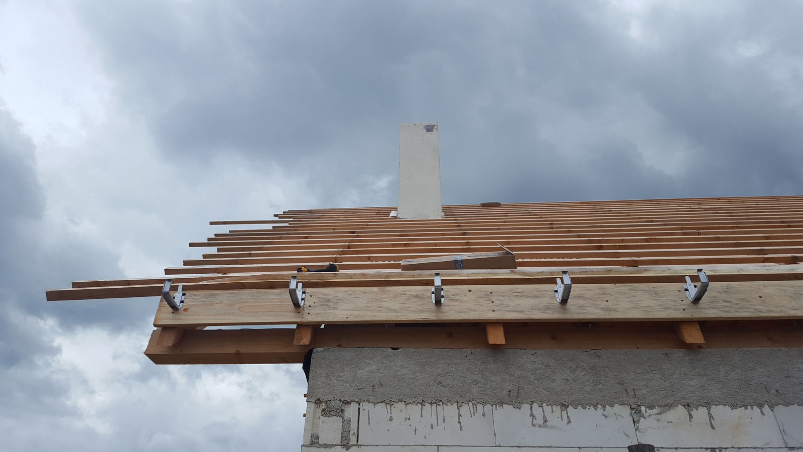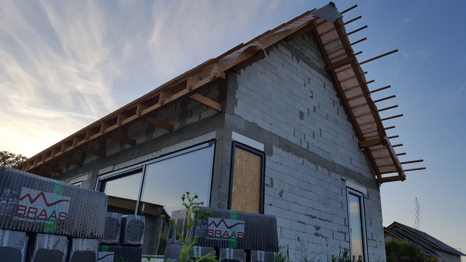 - 26.06.2017 pierwszym działaniem jest przykręcenie desek okapowych do końcówek krokwi, następnie mocowane są haki rynien