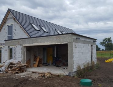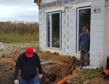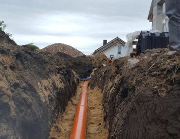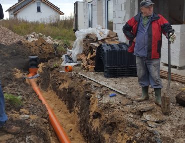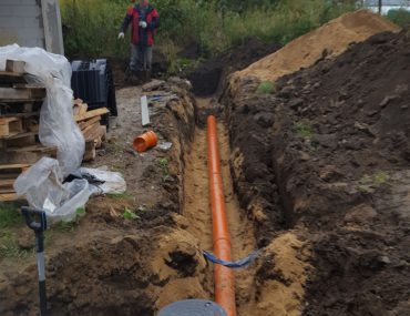 Trasa kanalizacji od budynku biegnie przecinając podjazd do garażu, jest jeden większy skręt, który wykonaliśmy na dwóch kolanach 45 stopni ze studnią. Kanalizacja wchodzi do przydomowej oczyszczalni znajdującej się obok podjazdu, a drenaż rozsączający znajduje się z tyłu obok garażu. Kanalizację prowadzimy w spadku min.2% rurami fi 160.