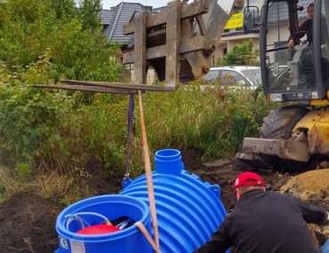 Montaż oczyszczalni trwał jeden dzień, do pracy potrzebna była pomoc koparki. W naszej inwestycji zdecydowaliśmy się na oczyszczalnię biologiczną hybrydową o pojemności 3000 l oczyszczona woda będzie rozsączana w gruncie za pośrednictwem 6 tuneli rozsączających. Materiały, które potrzebne były do montażu to: