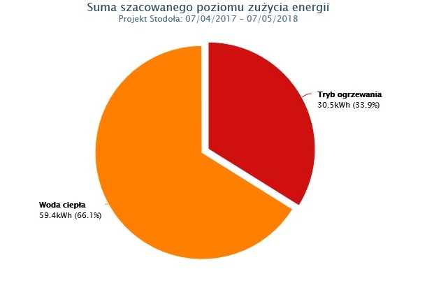 Modelowa Stodoła zamieszkana jest przez 2 osoby dorosłe oraz dwójkę malutkich dzieci, które spedzają praktycznie cały tydzień w domu. Obecne ustawienia to tryb CWU (ciepłej wody użytkowej) ustawiony na podgrzewanie wody do temperatury 50° w okresach porannych i wieczornych. Tryb CWU polega na podgrzeniu wody w zasobniku do zadanej temperatury w momencie gdy spadnie ona o 10° (poniżej 40°). Temperatura spada poprzez użytkowanie wody, gdy ciepła jest zużywana i zastępowana nową, zimną wodą. Pompa cyrkulacyjna jest włączona przez cały dzień od 6-23:00 (pompa, która sprawia, że ciepła woda krąży po instalcji domu i po odkręceniu kranu mamy od razu ciepłą wodę).