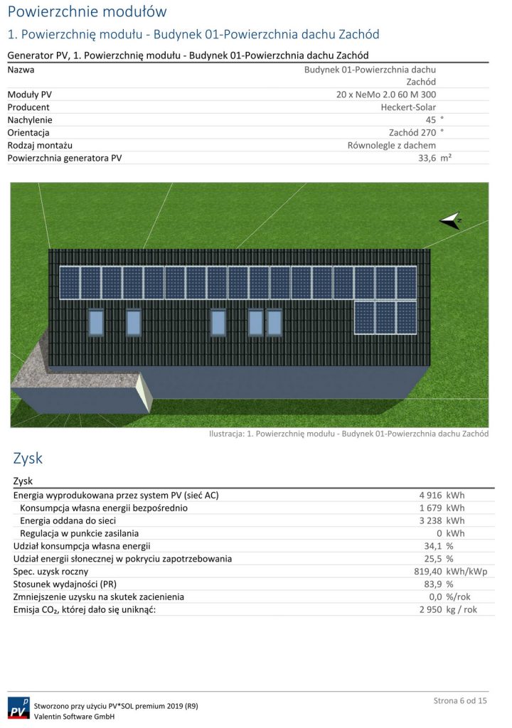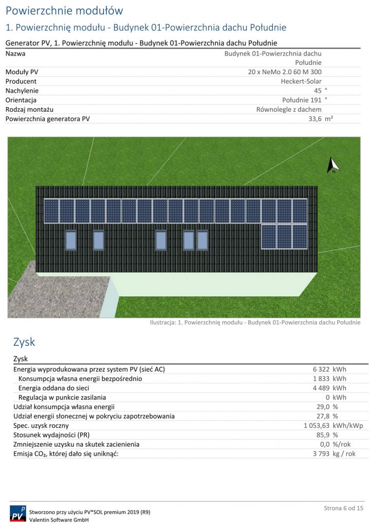 Usytuowanie Projektu Stodoła odchylone jest o 11° od południa na dachu o kącie 45 stopni. Przy takim usytuowaniu 20 paneli fotowoltaicznych o sumarycznej mocy 6 kW generuje 6322 kWh rocznie. Gdybyśmy usytuowali identyczną Stodołę z identyczną instalacją na dachu w kierunku zachodnim instalacja generowałaby 4916 kWh rocznie.