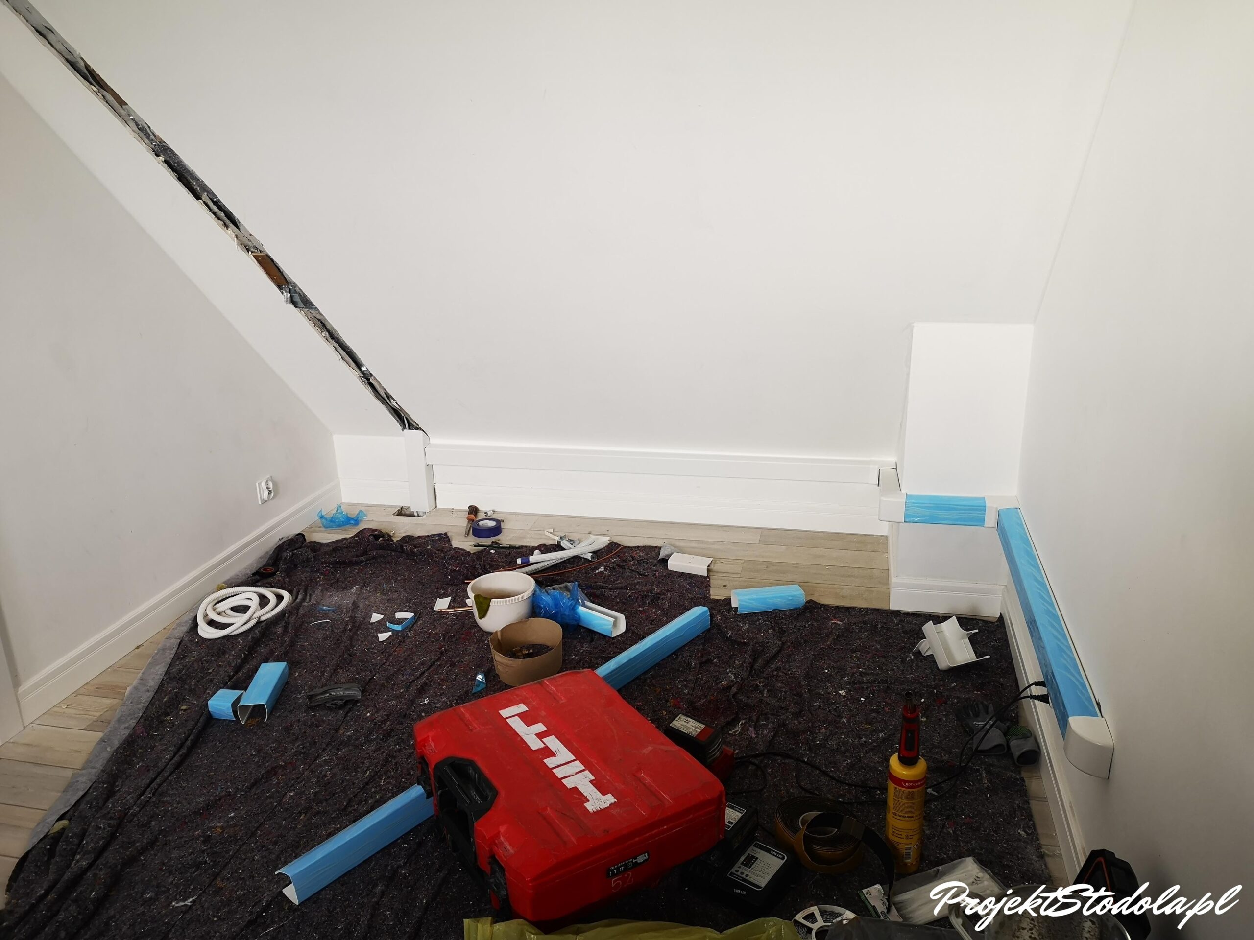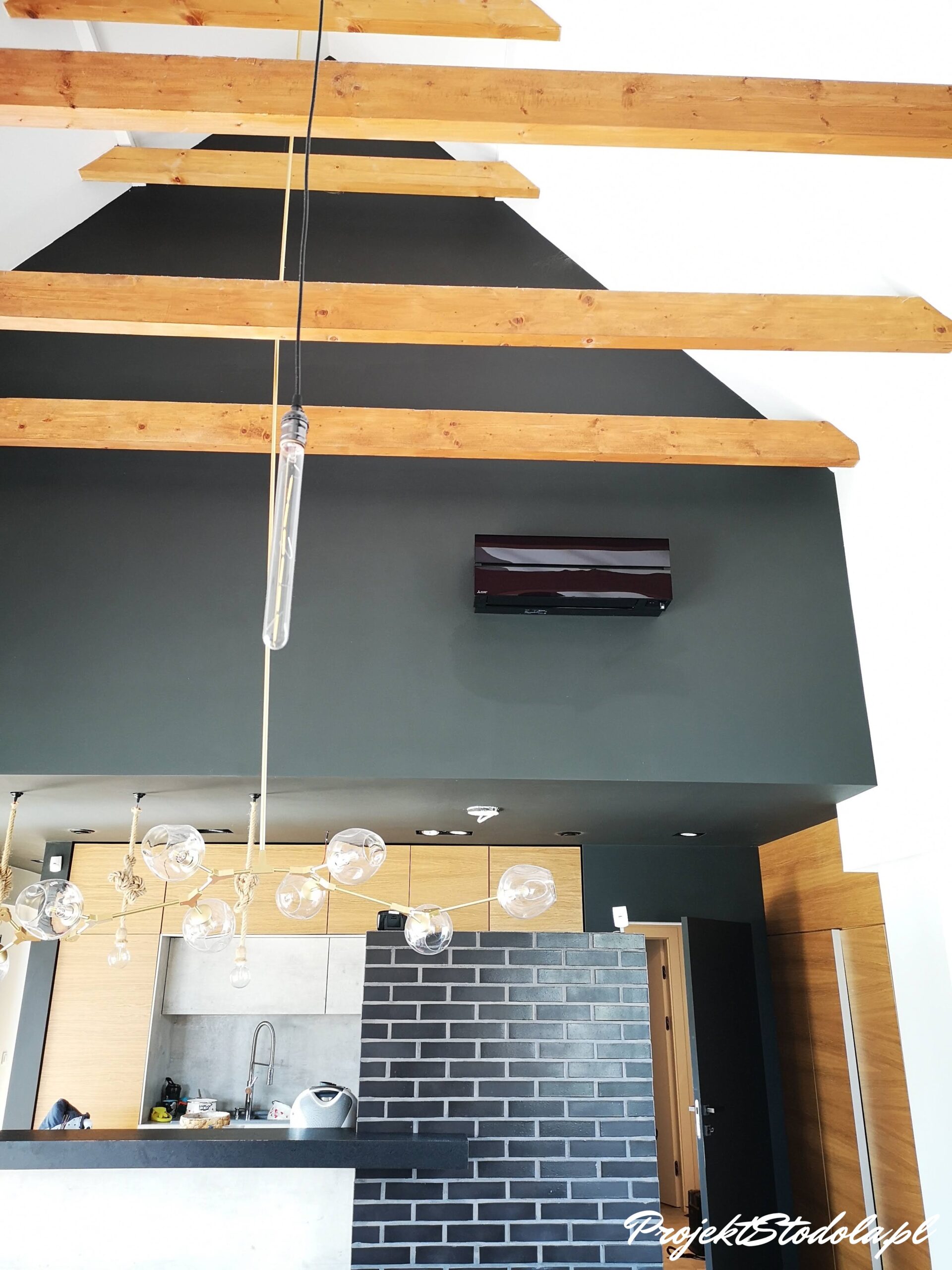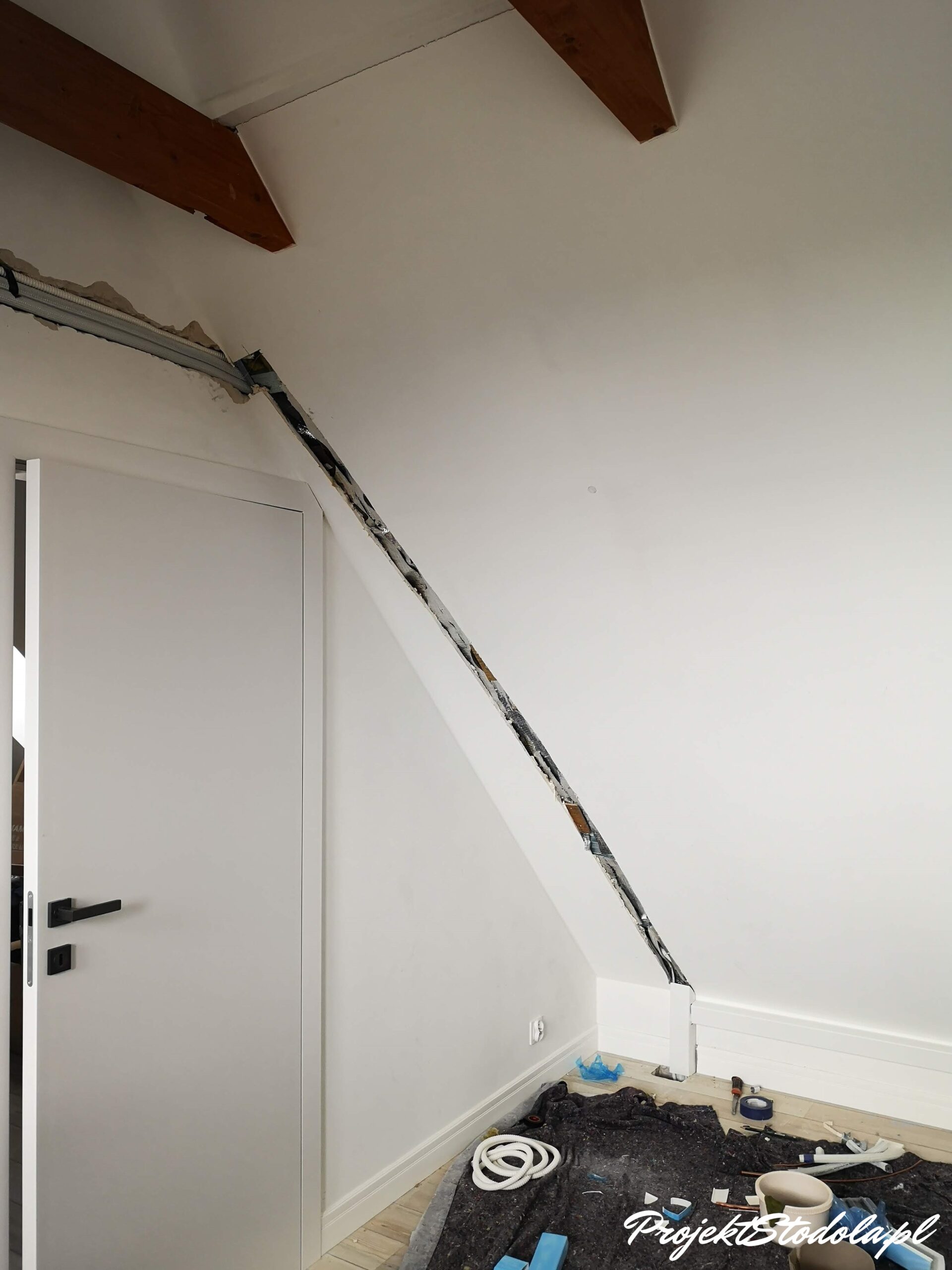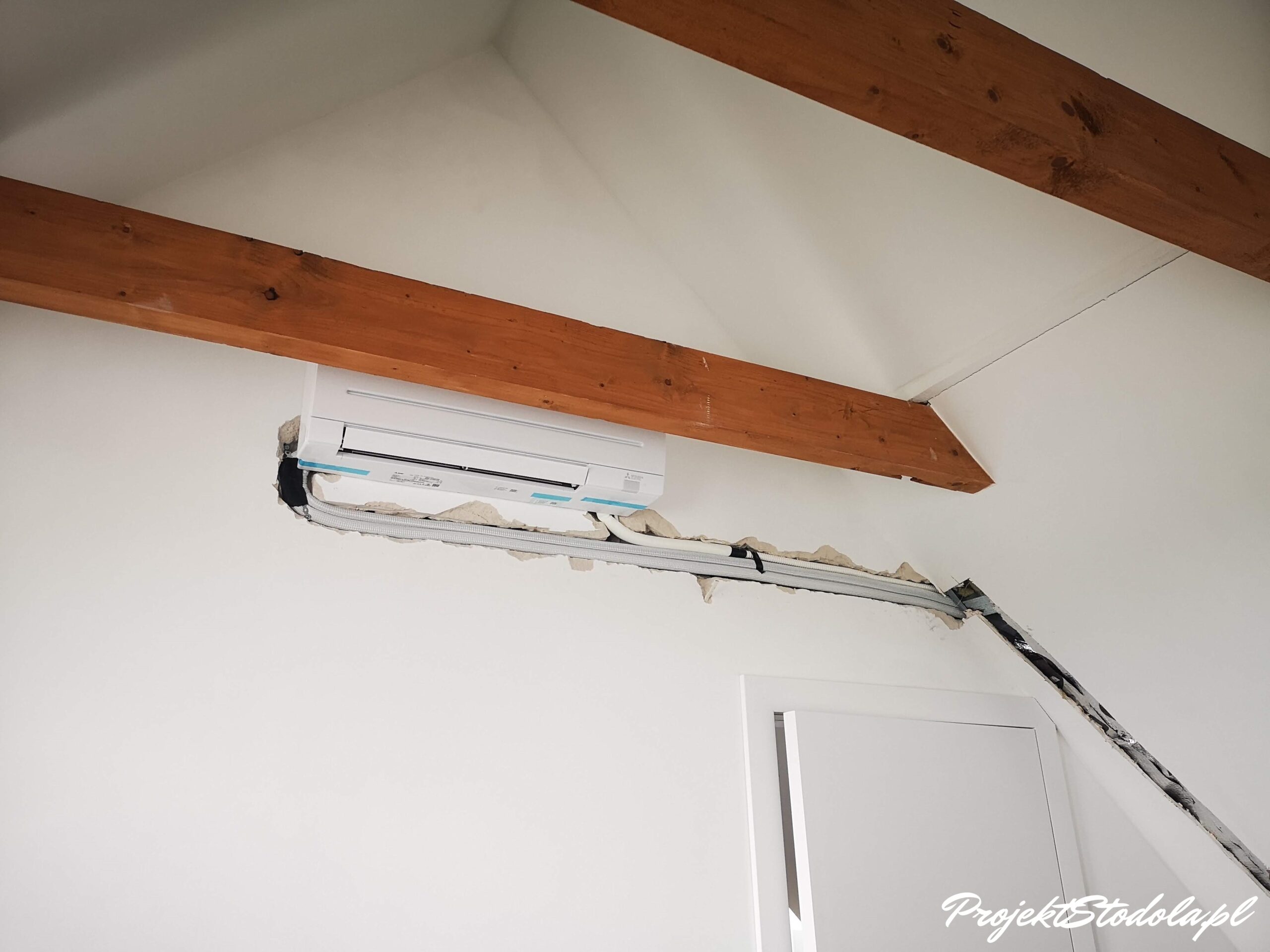 Przewody chłodnicze wkuliśmy w ścianę lub umieściliśmy je w dachu. Co przy pracy w gotowym już budynku wymagało o wiele większej ingerencji. Jednak nie moglibyśmy znieść widoku korytek instalacyjnych na ścianach, dlatego podjęliśmy się tego wyzwania 😊 Na szczęście o fachowy montaż klimatyzacji w naszej stodole zadbała firma instal3d z Wrocławia, z którą współpracujemy już dłuższy czas.