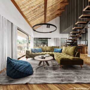 Projekt Stodoła M Parterowa to parterowa wersja naszej modelowej Stodoły M. Wszystkie główne założenia oraz układ funkcjonalny bazuje na tym projekcie. Główna oś komunikacyjna w budynku prowadzi od wejścia wzdłuż południowej przeszklonej ściany, aż do salonu i zakończona jest oknem. W pierwszej części domu znajduje się strefa prywatna- 2 pokoje, łazienka i część techniczna. Za garażem znajduje się sypialnia główna z łazienką i garderobą. Sypialnia główna oraz salon otwiera się na część ogrodową działki. Salon jest wysoki, otwarty aż do samej konstrukcji dachu z widoczną antresolą nad kuchnią.