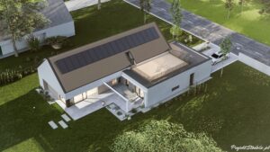 Warto również wspomnieć, że budynek ma od strony ogrodowej wysunięty okap, który jest elementem charakterystycznym naszych projektów, ale również pełni funkcję regulacji ochrony pomieszczeń przed przegrzewaniem, zachowując możliwość pasywnego ogrzewania latem.