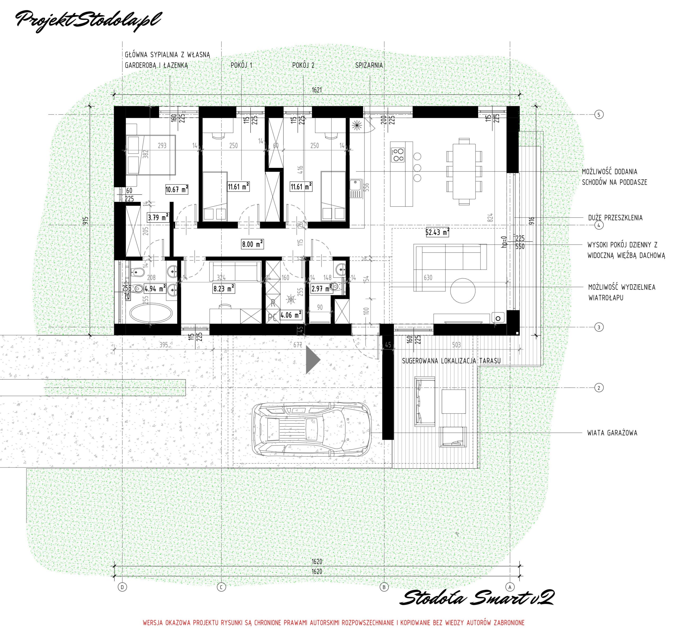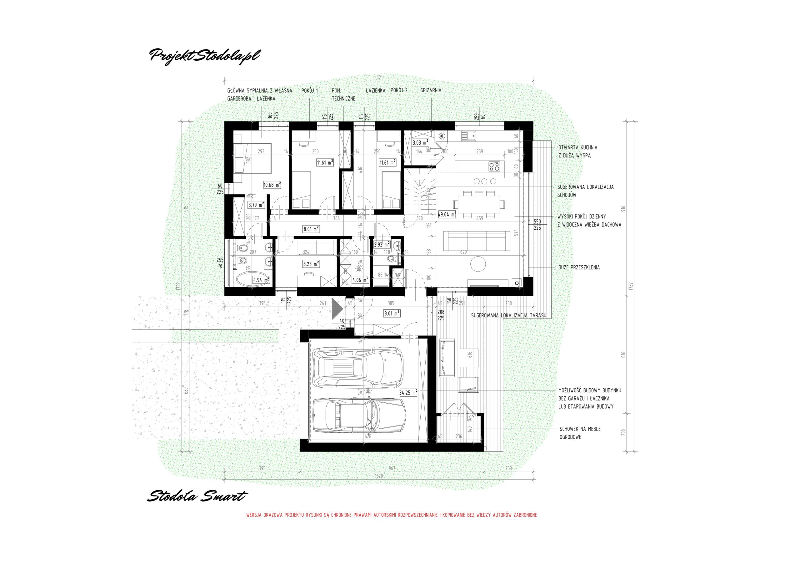 Projekt Stodola Smart to budynek przemyślany w każdym detalu, by był optymalny w budowie oraz by umożliwić etapowanie budowy. Na początku możemy wybudować tylko budynek mieszkalny, a w drugim etapie wybudować garaż lub wiatę. Smart ma bardzo dużo możliwości zmiany. Prosty plan, jednoprzestrzenny, dwukondygnacyjny salon z dużym przeszkleniem, możliwość adaptacji poddasza czy zadaszony taras za garażem.