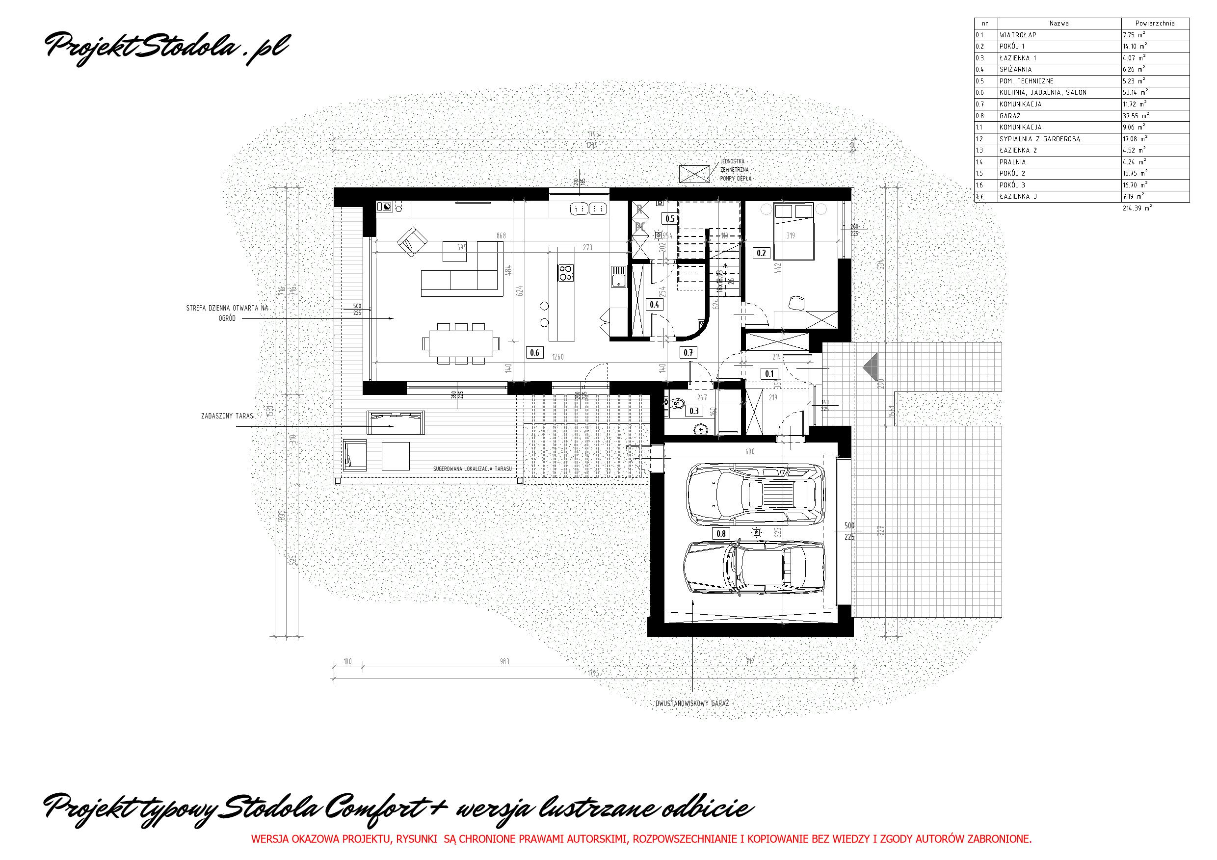 Projekt zagospodarowania działki z częścią opisową należy trwale połączyć z Projektem Budowlanym lub zamieścić w osobnej oprawie: tomie (teczce), stanowiącym z zakupionym Projektem Typowym komplet Projektu Budowlanego.