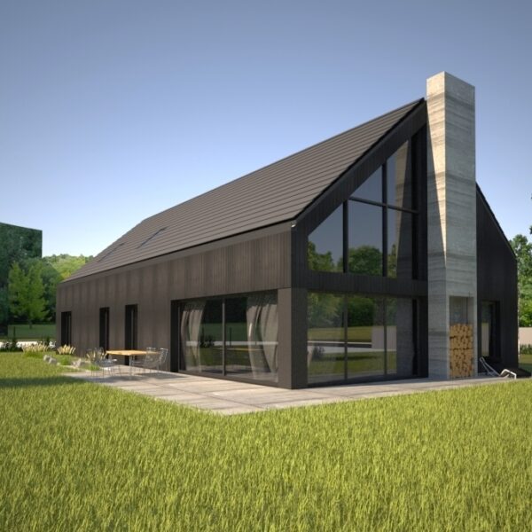 Nowoczesny i minimalistyczny dom parterowy z poddaszem, na planie prostokąta, przewężonego w strefie pokoi. Budynek przykryty jest symetrycznym dachem wielospadowym o kącie nachylenia 25° (kalenica równoległa do drogi dojazdowej). Elewacja budynku- nowoczesna, naturalna i ponadczasowa deska opalana. Istnieje możliwość dopasowania materiałów tak, by nawiązać do lokalnego kontekstu lub indywidualnych upodobań inwestora. Dookoła budynku znajduje się weranda z zamontowanymi panelami przesuwnymi, które umożliwiają elastyczne kontrolowanie nasłonecznienia przestrzeni.