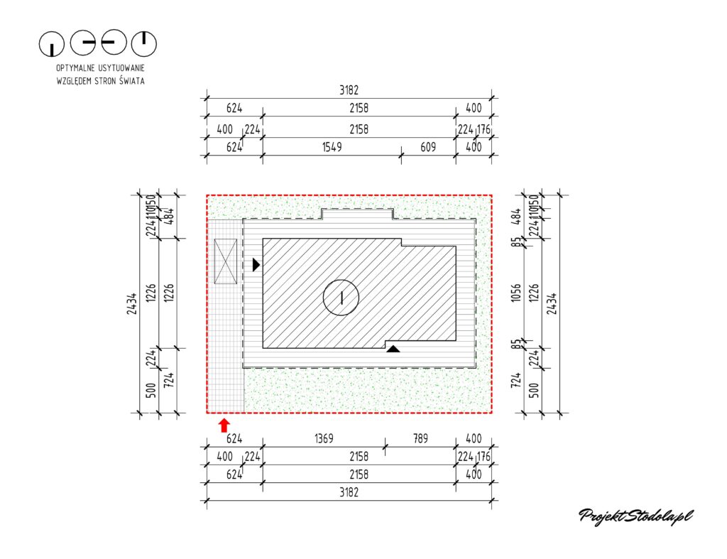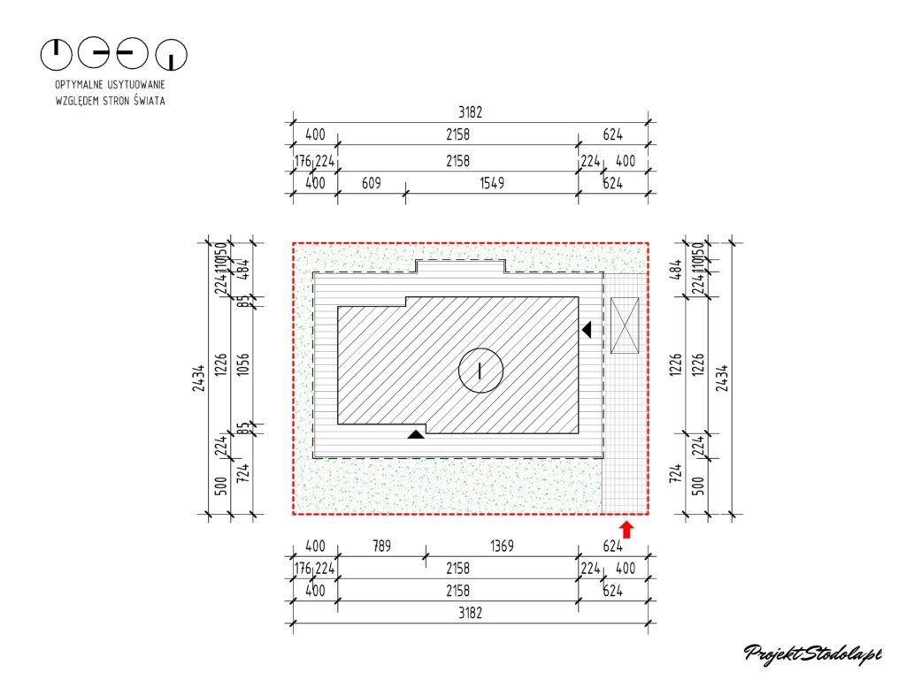 - Wariant 1 – wjazd z miejscem parkingowym od boku budynku Minimalne wymiary działki: 31,82 x 24,34