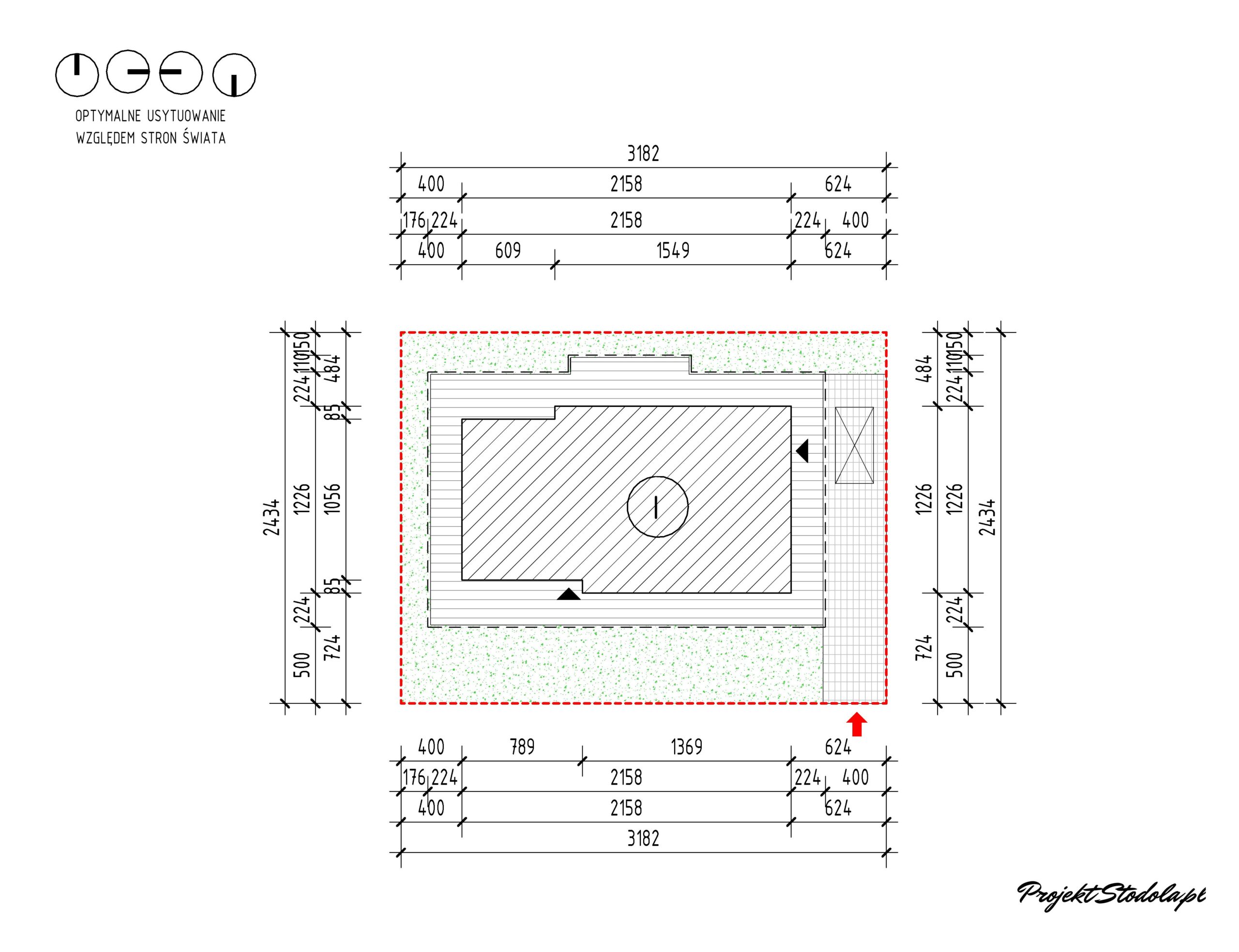 - Wariant 1 – wjazd z miejscem parkingowym od boku budynku Minimalne wymiary działki: 31,82 x 24,34