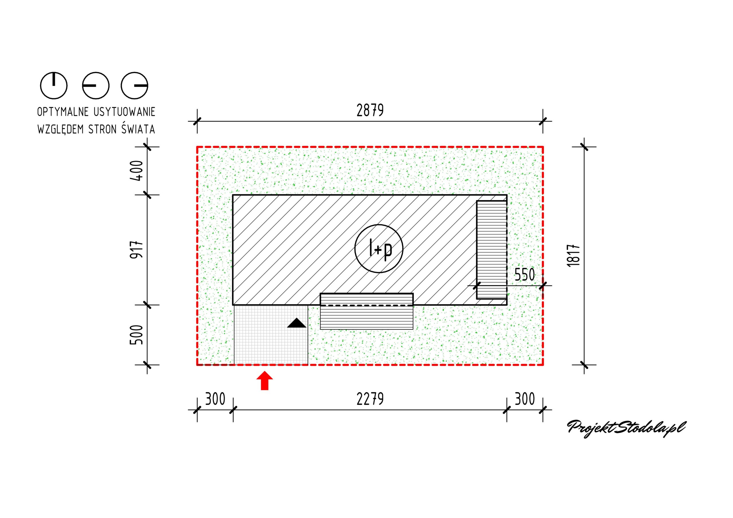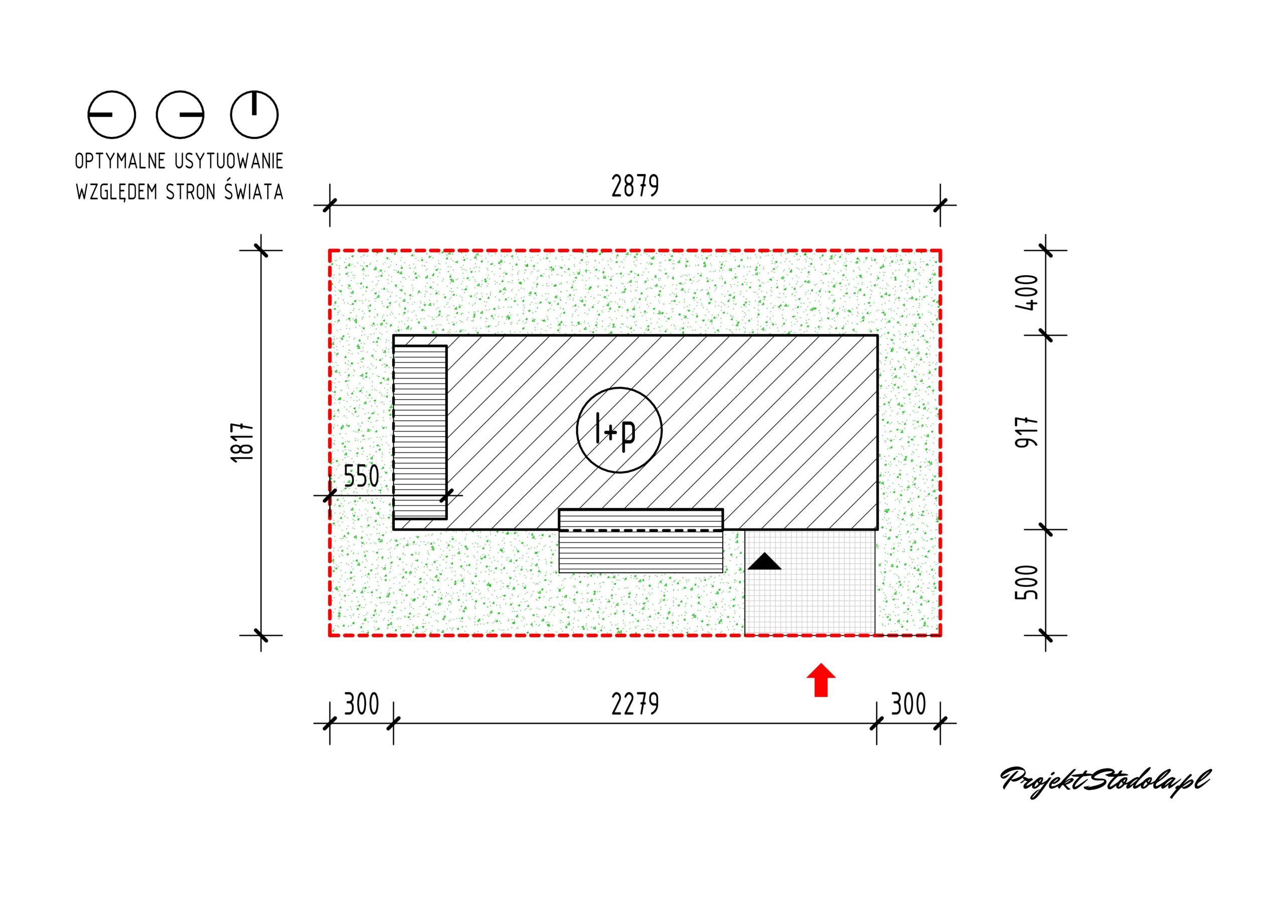 Budynek można usytuować w kilku wariantach. Podstawowy wariant jest przy wjeździe od strony wschodniej oraz północnej (Wariant 1 ). Jest możliwość zaprojektowania wjazdu i wejścia do budynku od strony południowej (Wariant 2 możliwy do realizacji jako zmiany w wariancie podstawowym). W projekcie jest możliwość także rezygnacji z garażu i zaaranżowania tej powierzchni na pokoje mieszkalne lub biuro, gabinet. W przypadku potrzeby powiększenia budynku, garaż można usytuować od strony bocznej, a powstałą przestrzeń w bryle głównej zaadaptować na pokoje mieszkalne lub biuro, gabinet (Wariant Stodoła L+). Tak rozwiązany budynek będzie miał powierzchnię równą ok. 272 m2.