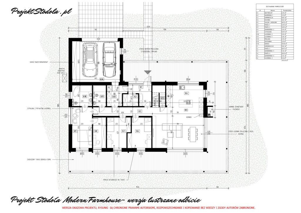 Czy szukasz czegoś innego, sielskiego i na czasie. Chciałbyś mieć wielki zadaszony taras i werandę przed domem? Dom z poddaszem Projekt Stodoła Modern Farmhouse to pierwszy z naszych projektów tego typu. Ten projekt projekt zawiera to wszystko dodatkowo posiada dużymi przeszkleniami w salonie, bardzo wygodną kuchnią ze spiżarnią i 5 sypialniami , to znalazłeś odpowiedź . Dookoła całego budynku zaprojektowaliśmy werandę. Ma przemyślany, intuicyjny układ funkcjonalny oraz prostotę budowy. Projekt jest z poddaszem użytkowym i ma wyeliminowana konstrukcję w salonie oraz bardzo duże przeszklenie przez które będziesz mógł podziwiać okoliczne otoczenie. Dodatkowo na elewacji zastosowano naturalne deski drewniane konserwowane poprzez opalanie. Oprócz tego w projekcie znajduje się garaż na dwa auta, który można również zlikwidować lub zmienić na inne przeznaczenie. Jak każdy z naszych projektów wyposażony jest w instalacje energooszczędne pompę ciepła i rekuperację.
