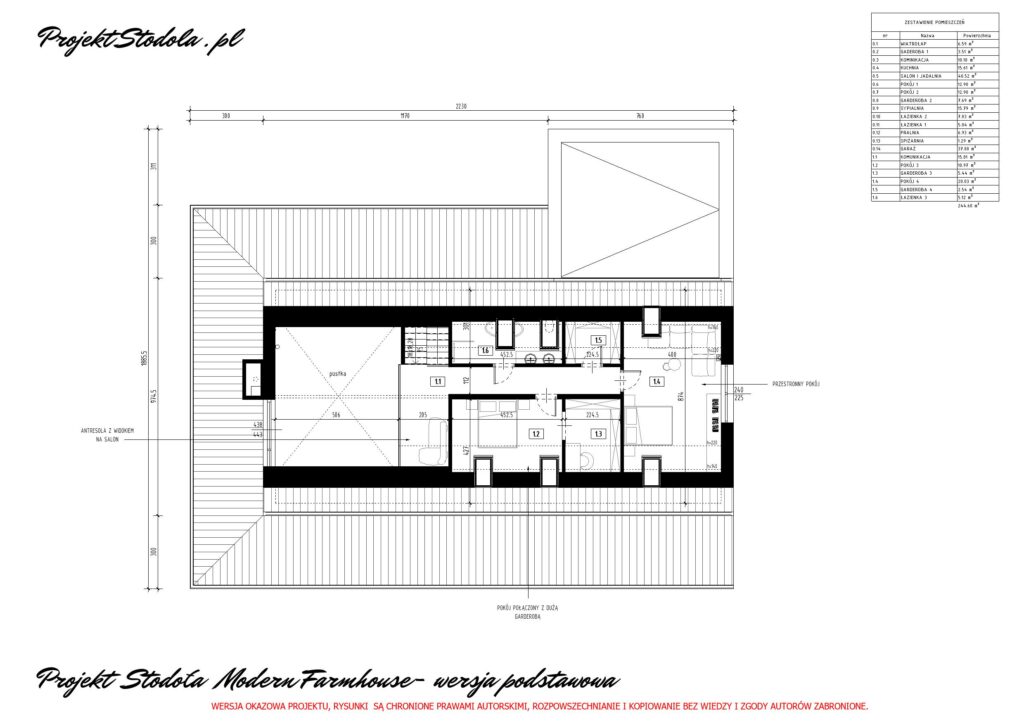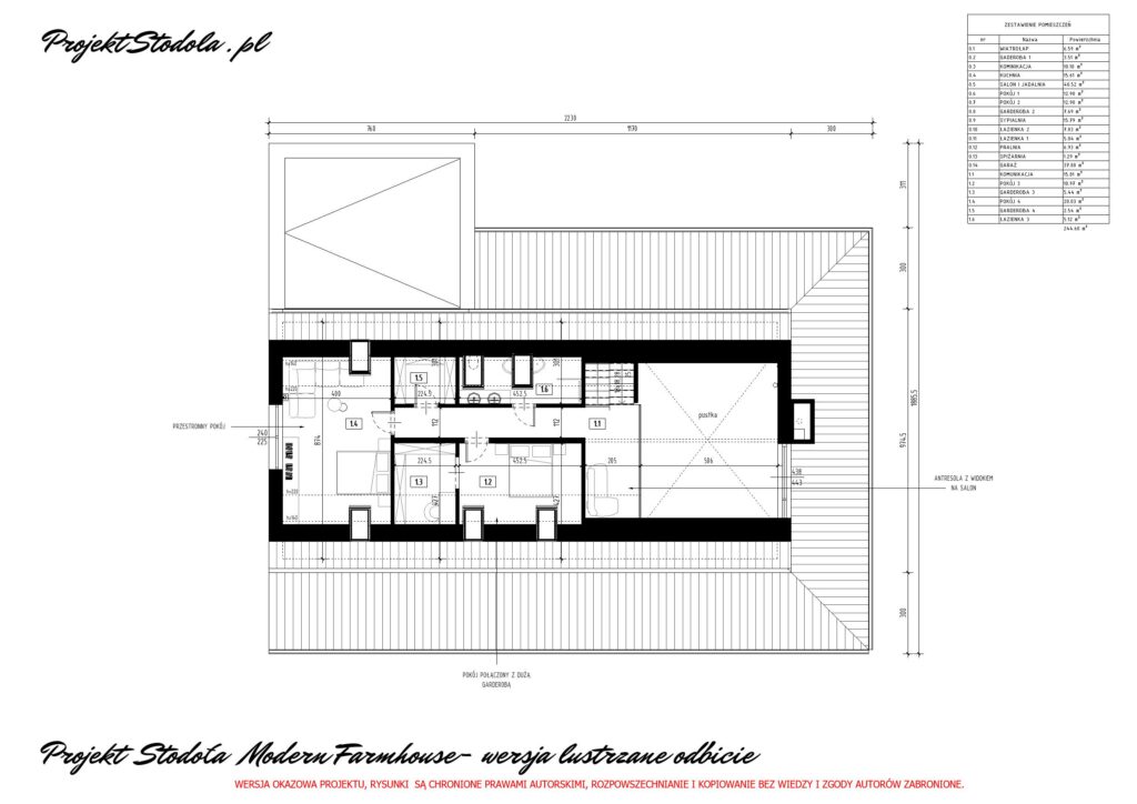 Poddasze użytkowe zawiera w sobie 2 duże pokoje, dużą łazienkę oraz 2 garderoby, przestrzeni na poddaszu jest bardzo dużo i można ją dowolnie zaaranżować. Na poddaszu znajduje się również otwarta antresola, którą można zagospodarować np. na bibliotekę. .