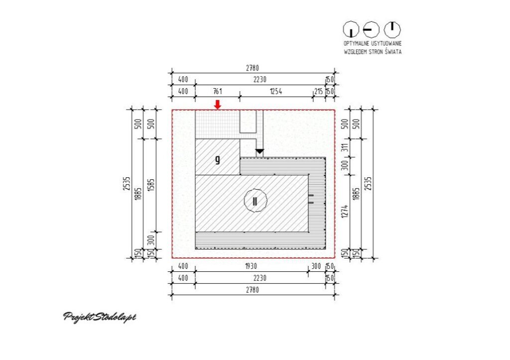Budynek można usytuować w kilku wariantach. W podstawowym przy wjeździe od preferowanej strony północnej (Wariant 1) .