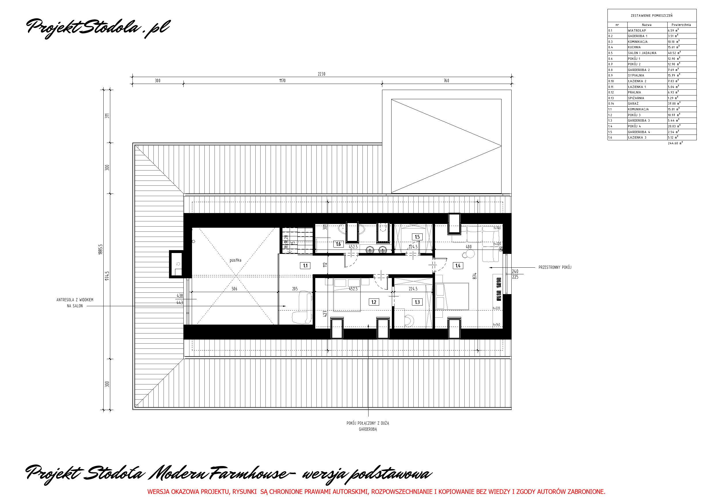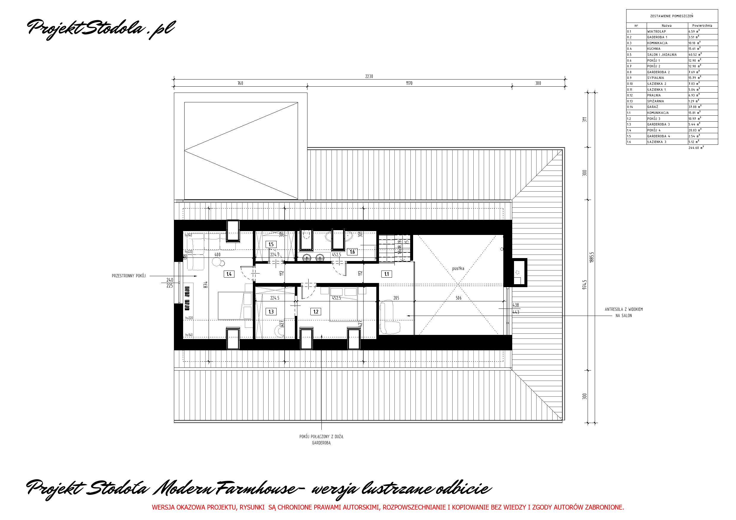 Poddasze użytkowe zawiera w sobie 2 duże pokoje, dużą łazienkę oraz 2 garderoby, przestrzeni na poddaszu jest bardzo dużo i można ją dowolnie zaaranżować. Na poddaszu znajduje się również otwarta antresola, którą można zagospodarować np. na bibliotekę. .