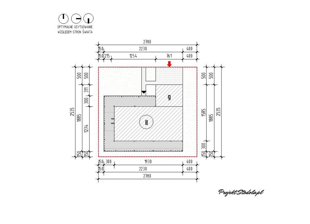 Budynek można usytuować w kilku wariantach. W podstawowym przy wjeździe od preferowanej strony północnej (Wariant 1) .