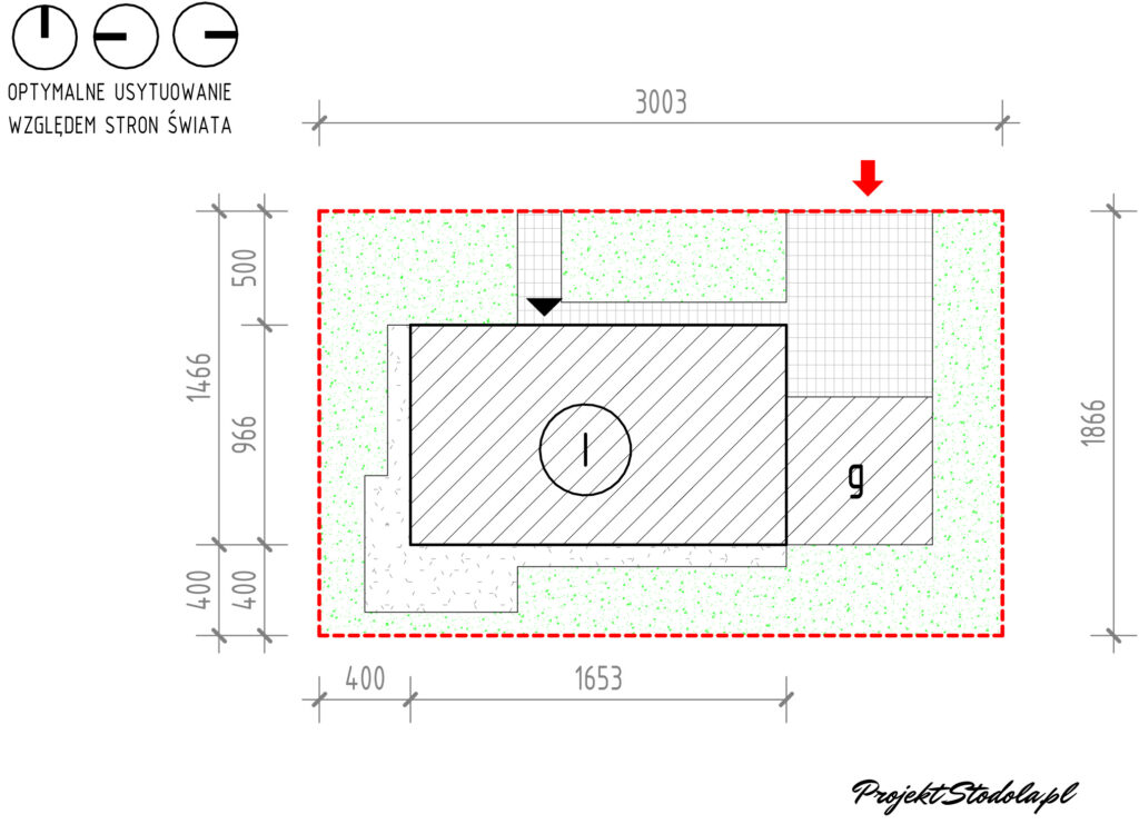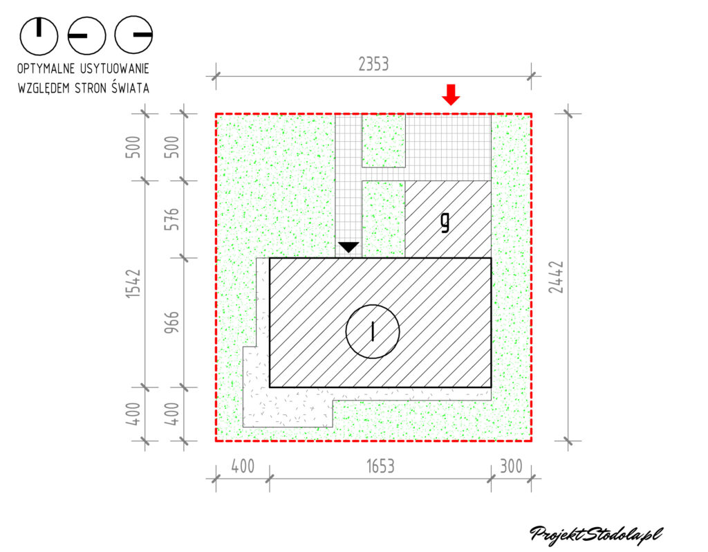 Najlepszym usytuowaniem jest wjazd od strony północnej działki, ale bardzo dobrze sprawdzi się również wjazd od strony wschodniej i zachodniej. Do budynku można dodać garaż (po delikatnej korekcie układu funkcjonalnego domu) jedno- lub dwustanowiskowy. Poniżej przedstawiamy różne warianty usytuowania na działce budynku z garażem lub bez.