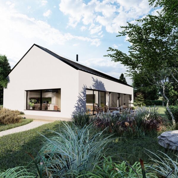 Prosty dom parterowy typu nowoczesna stodoła, na planie prostokąta, przykryty dwuspadowym, symetrycznym dachem, o kącie nachylenia 30°. Budynek utrzymany w jednolitej i minimalistycznej stylistyce. Wyeliminowano akcenty w formie zadaszeń, okapów, by budynek był uniwersalny, ale przede wszystkim nie generował dodatkowych kosztów podczas budowy.