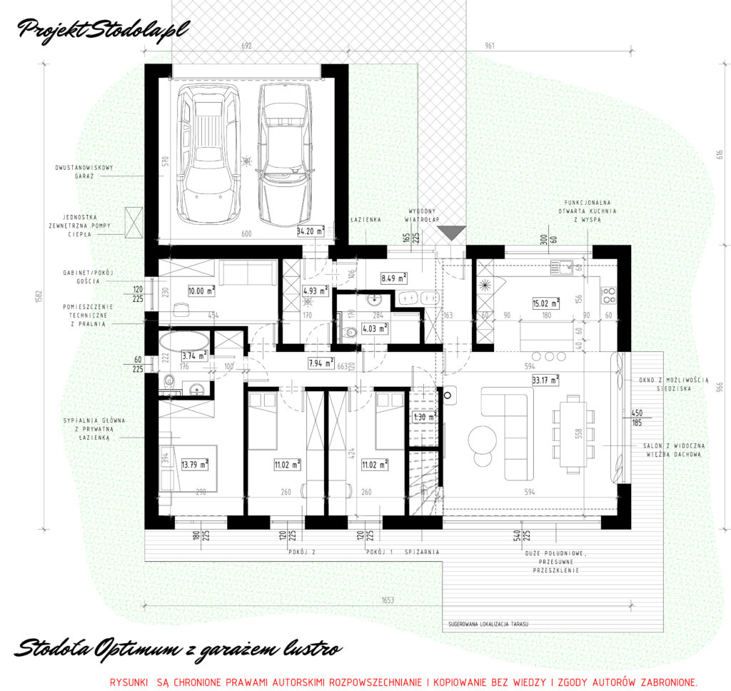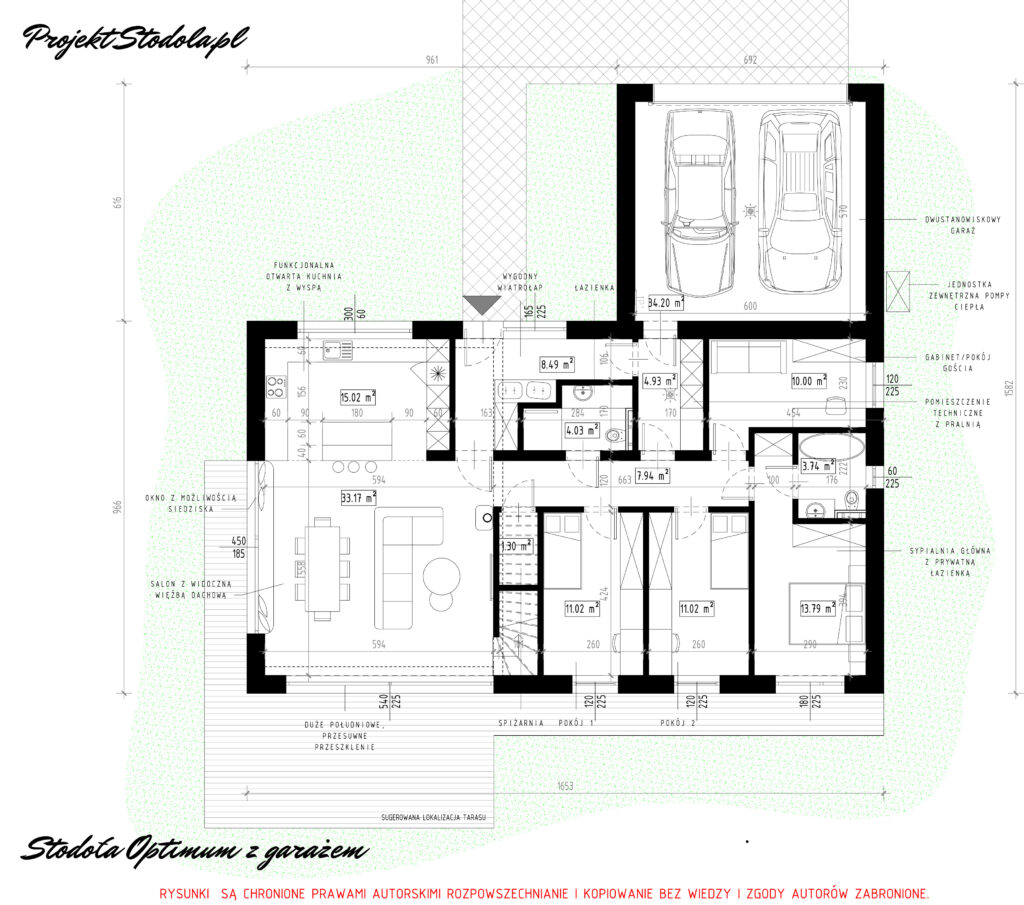 Stodoła Optimum z garażem to dom parterowy, ekonomiczny w budowie, zoptymalizowany pod katem funkcji, konstrukcji i energooszczędności. Posiada prosty, czytelny układ funkcjonalny. W strefie wejściowej znajduje się wygodny wiatrołap z miejscem na dużą szafę z siedziskiem, doświetlony dużym przeszkleniem, połączony z pomieszczeniem technicznym i z garażem.