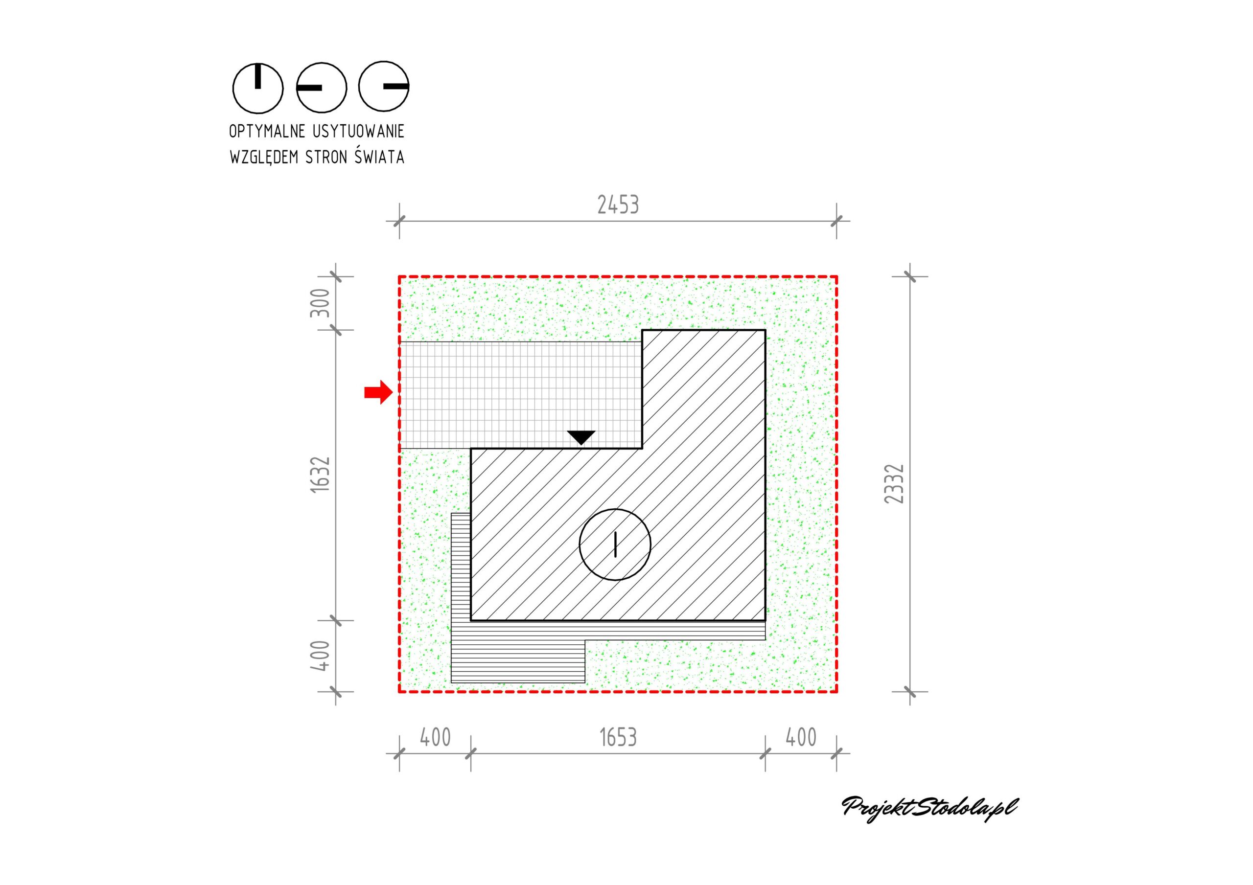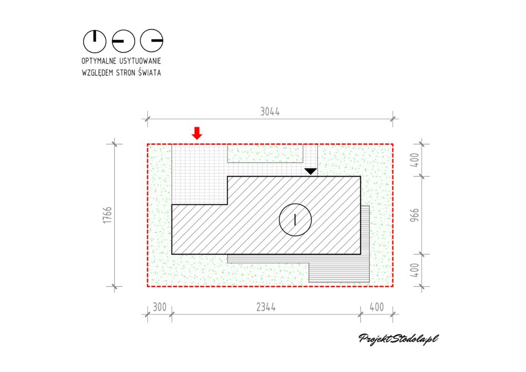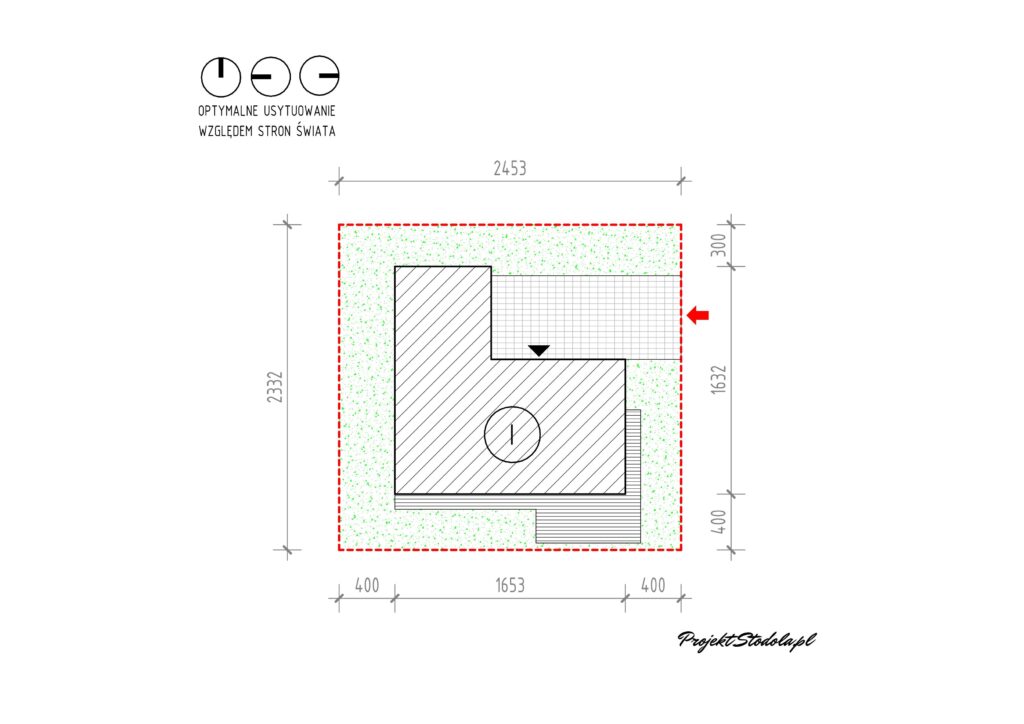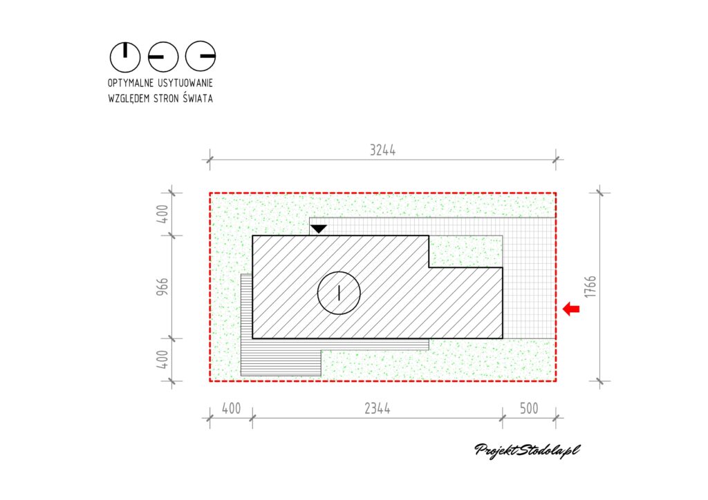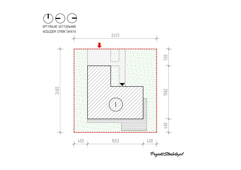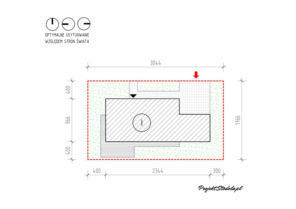 Najlepszym usytuowaniem jest wjazd od strony północnej działki, ale bardzo dobrze sprawdzi się również wjazd od strony wschodniej i zachodniej. Poniżej przedstawiamy różne warianty usytuowania na działce budynku z garażem.