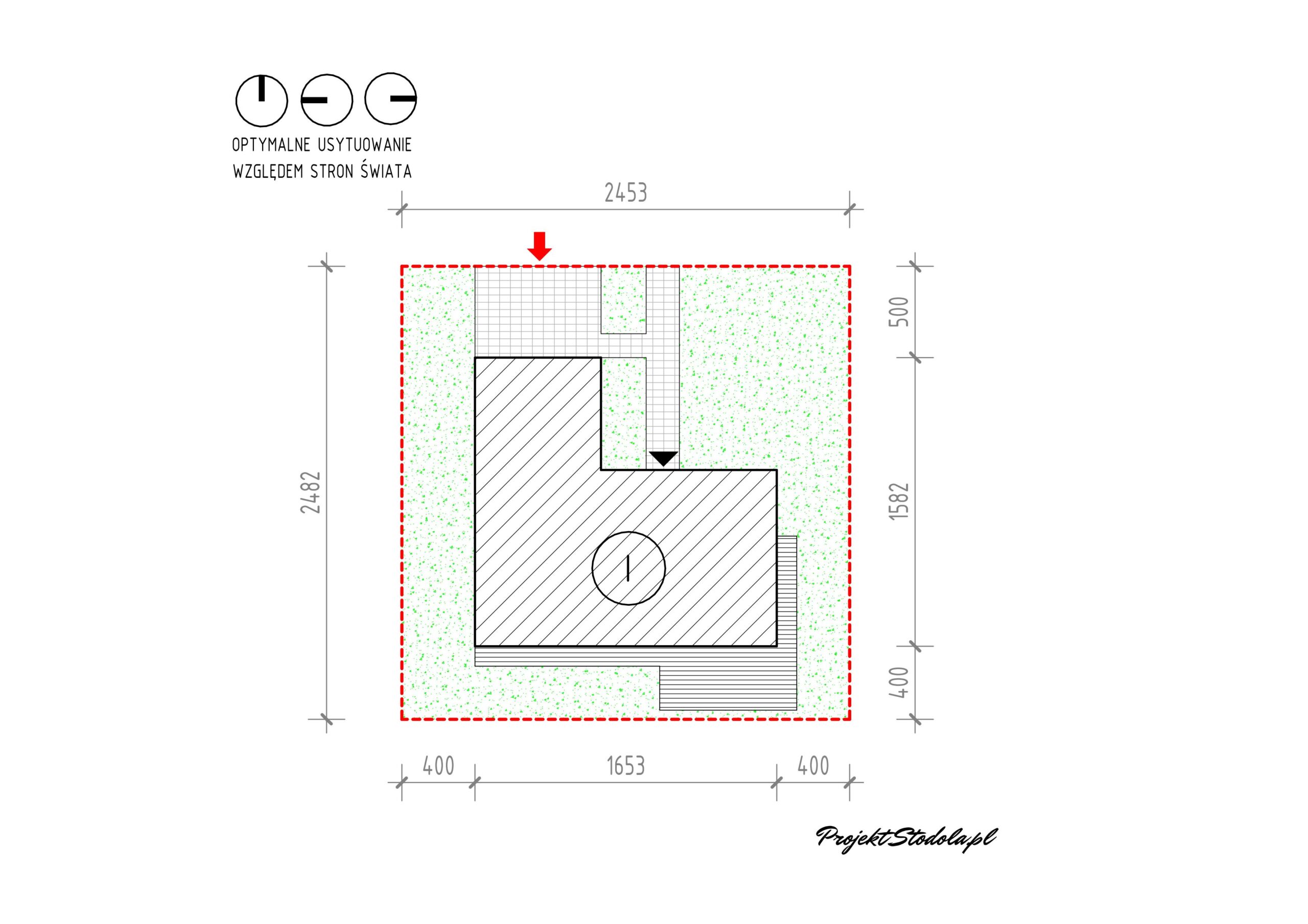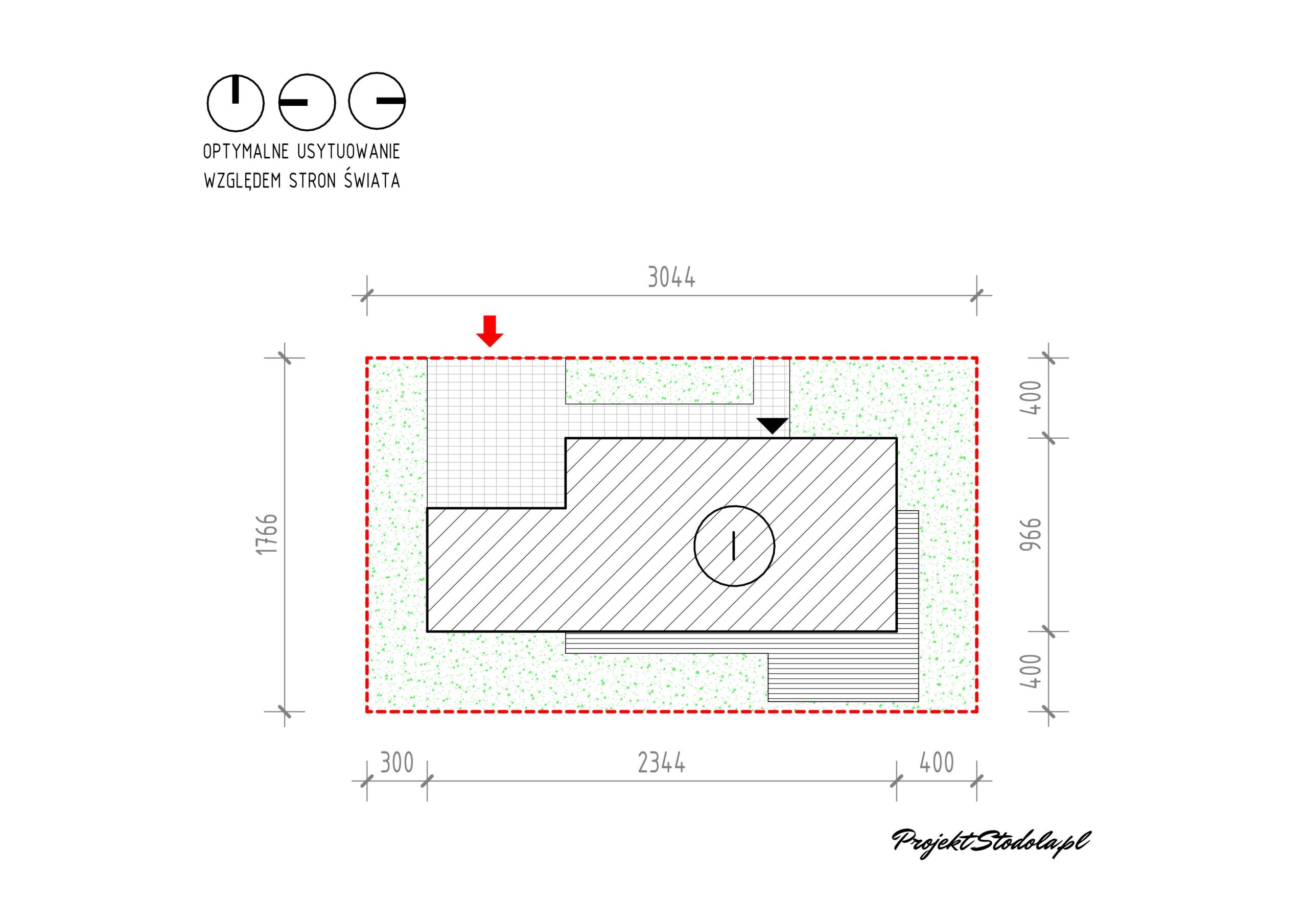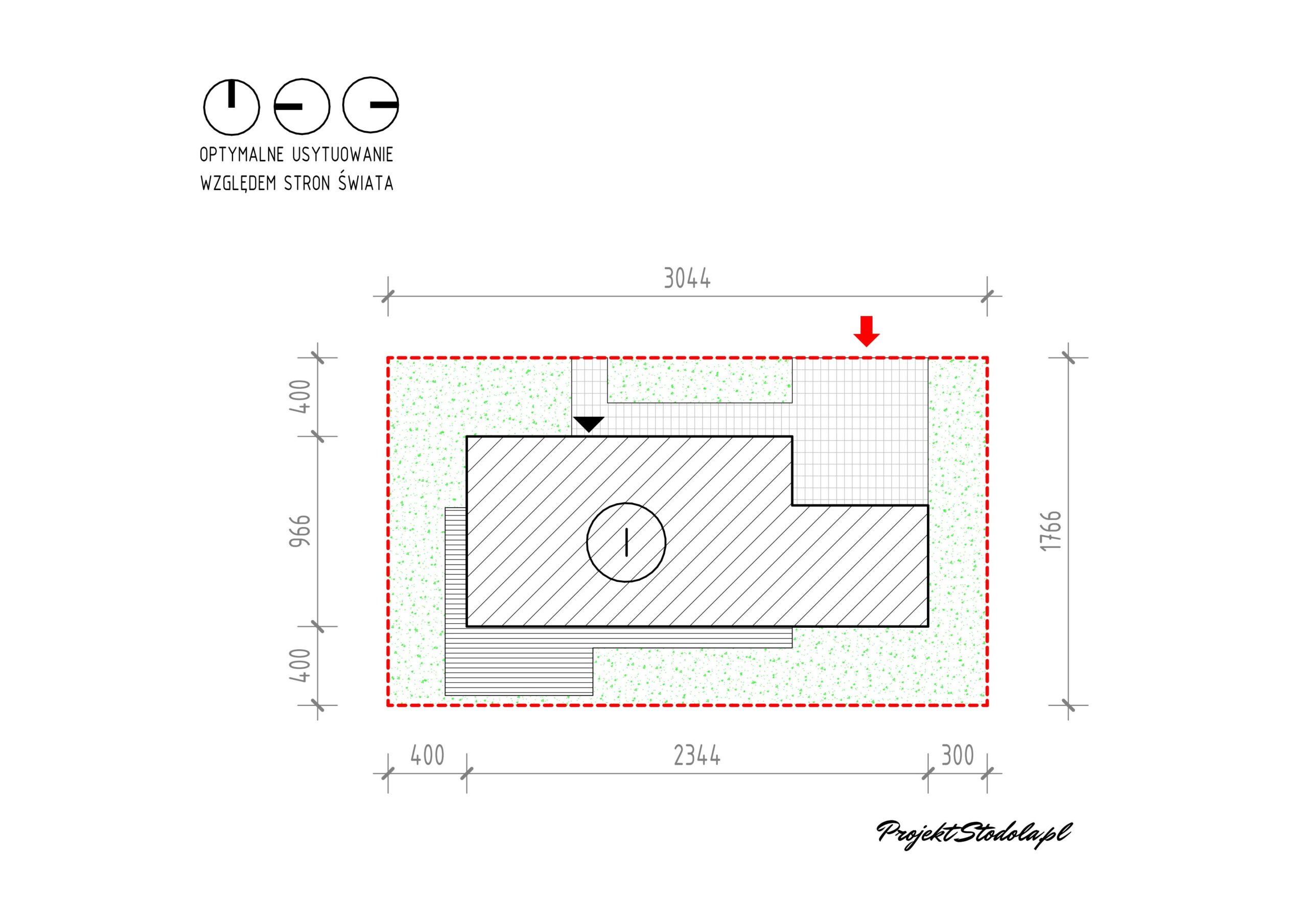 Najlepszym usytuowaniem jest wjazd od strony północnej działki, ale bardzo dobrze sprawdzi się również wjazd od strony wschodniej i zachodniej. Poniżej przedstawiamy różne warianty usytuowania na działce budynku z garażem.
