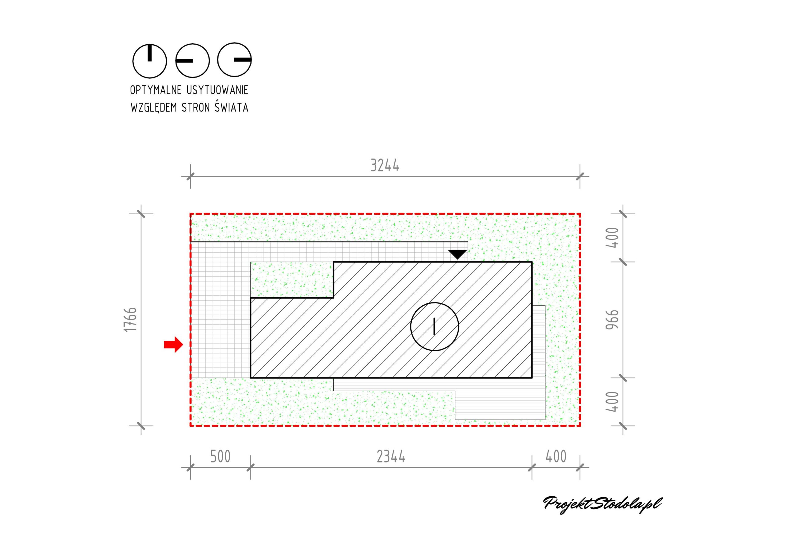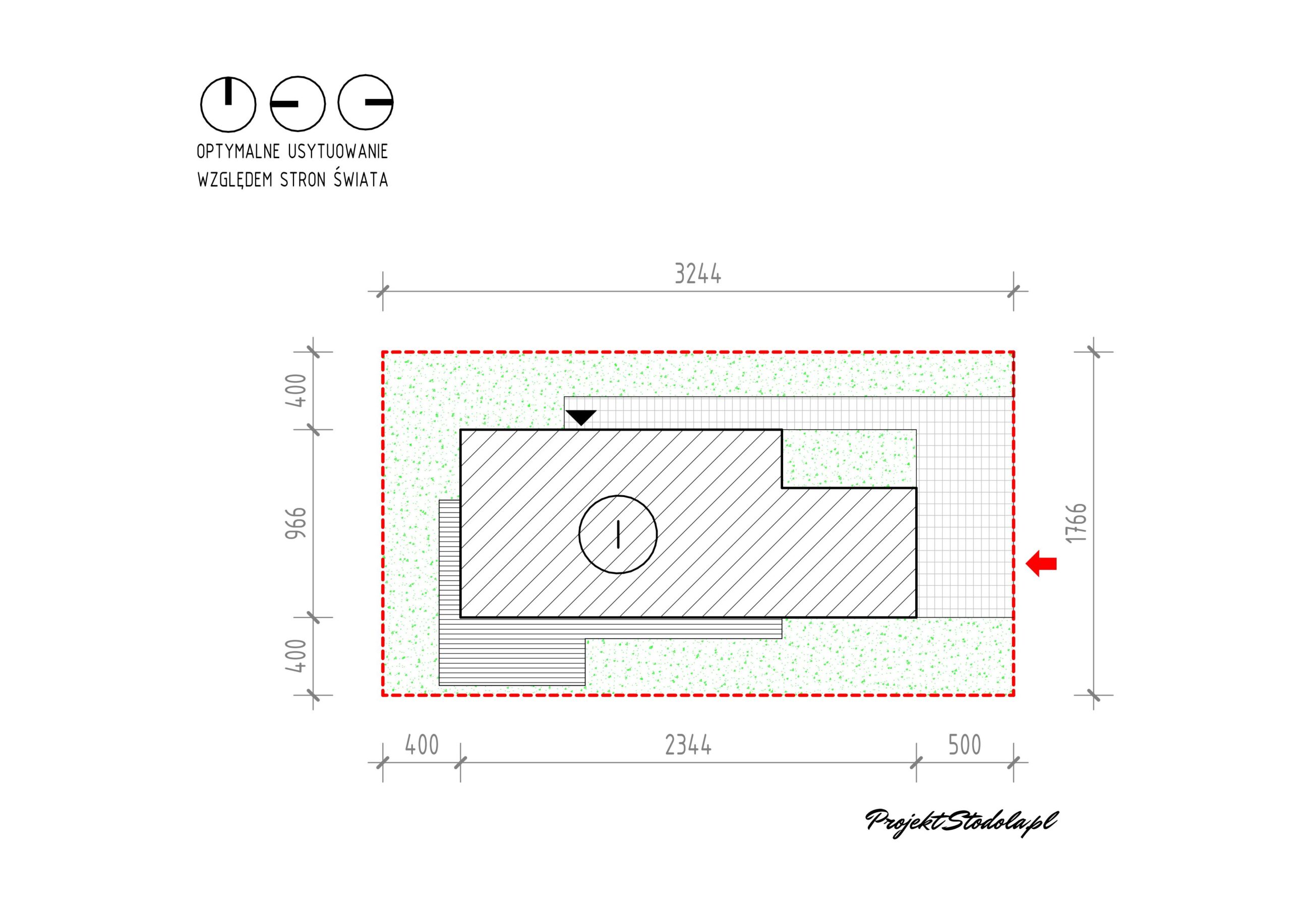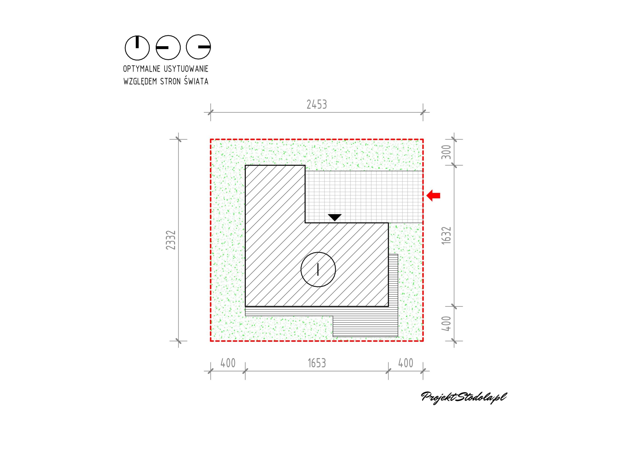 Najlepszym usytuowaniem jest wjazd od strony północnej działki, ale bardzo dobrze sprawdzi się również wjazd od strony wschodniej i zachodniej. Poniżej przedstawiamy różne warianty usytuowania na działce budynku z garażem.