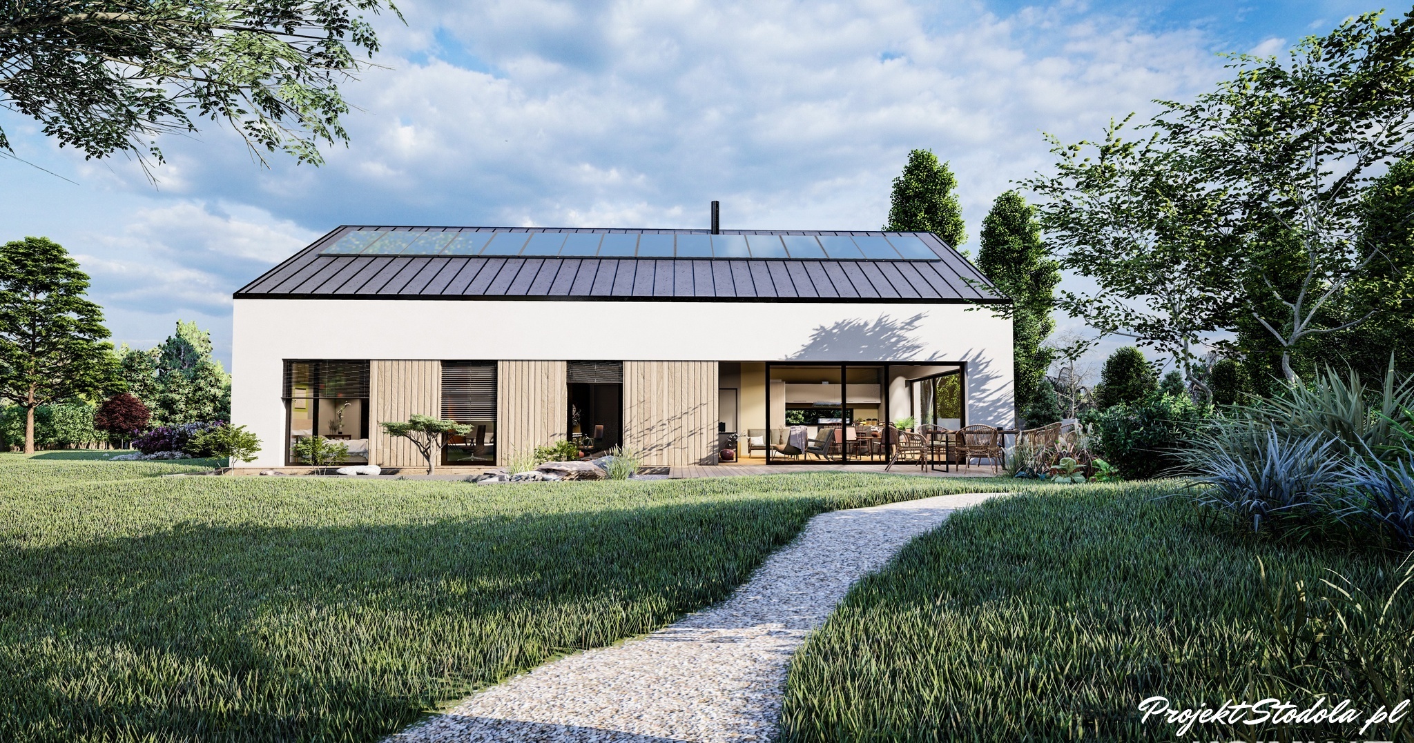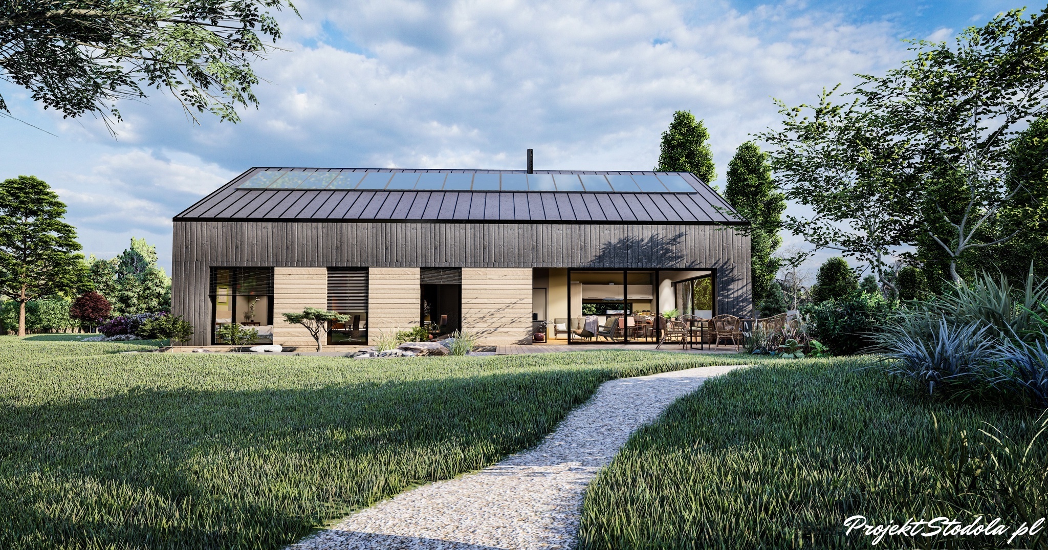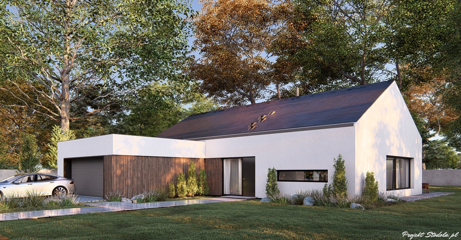 Prosty dom parterowy typu nowoczesna stodoła, na planie prostokąta, przykryty dwuspadowym, symetrycznym dachem, o kącie nachylenia 30°. Budynek utrzymany w jednolitej i minimalistycznej stylistyce. Wyeliminowano akcenty w formie zadaszeń, okapów, by budynek był uniwersalny, ale przede wszystkim nie generował dodatkowych kosztów podczas budowy.