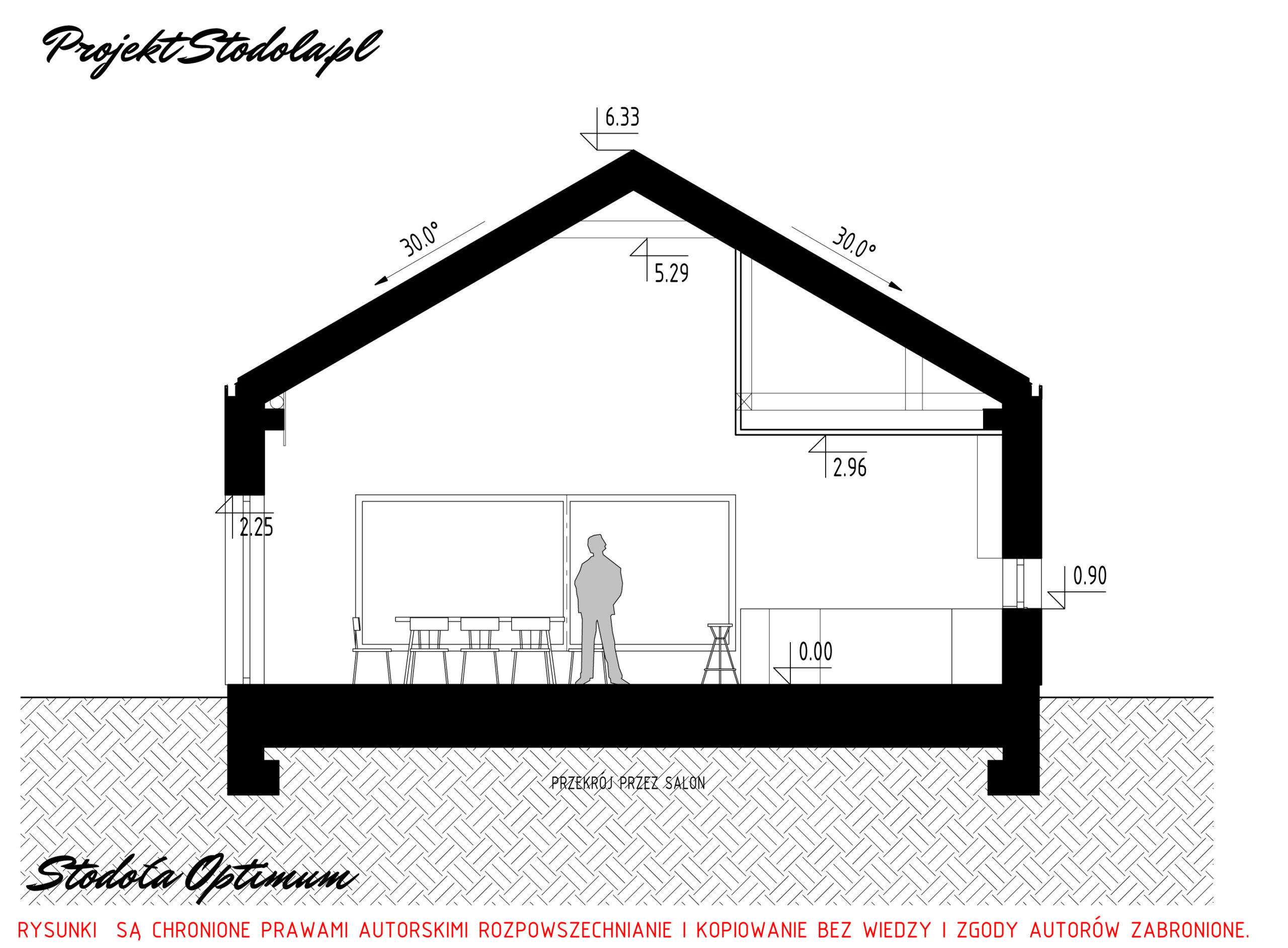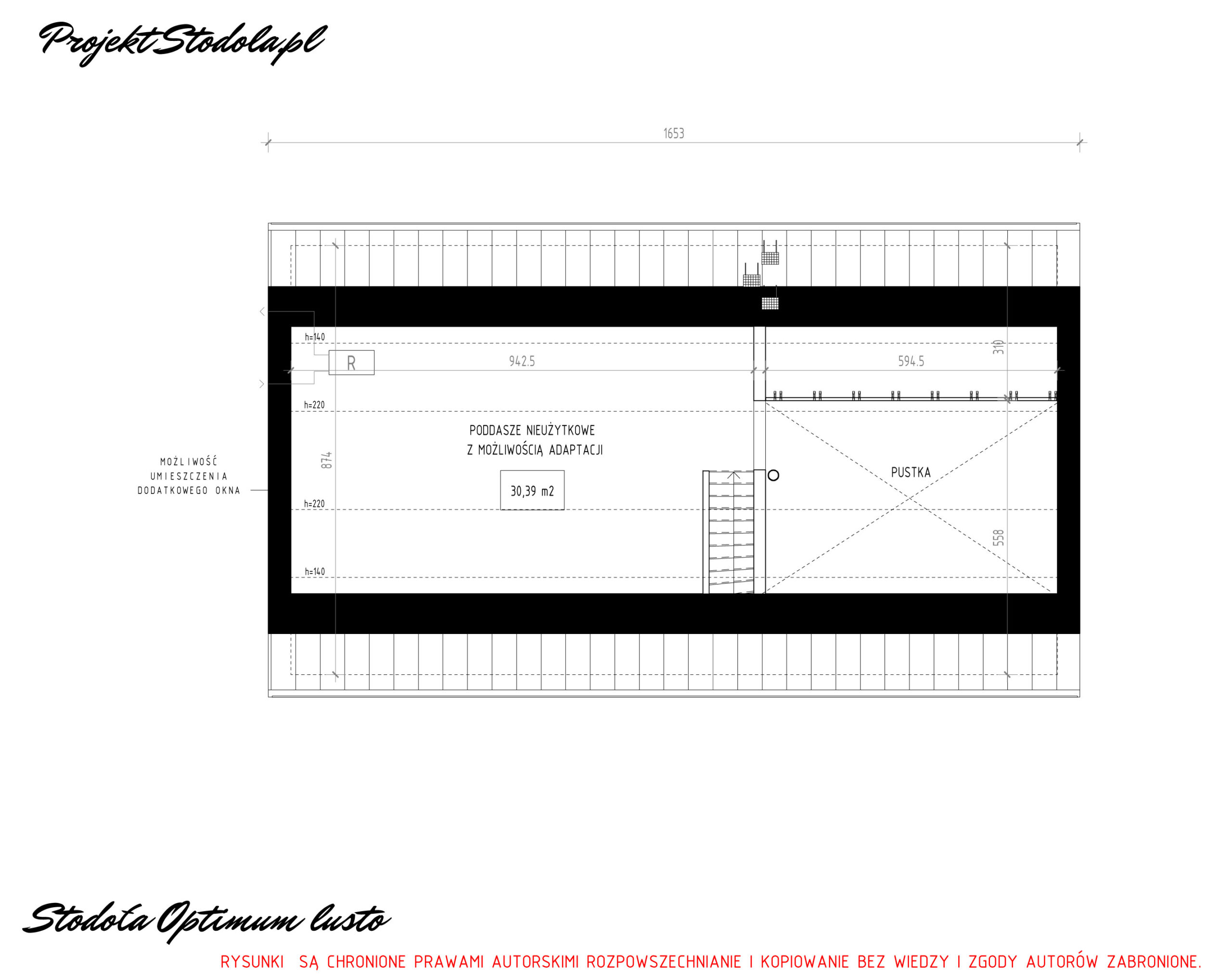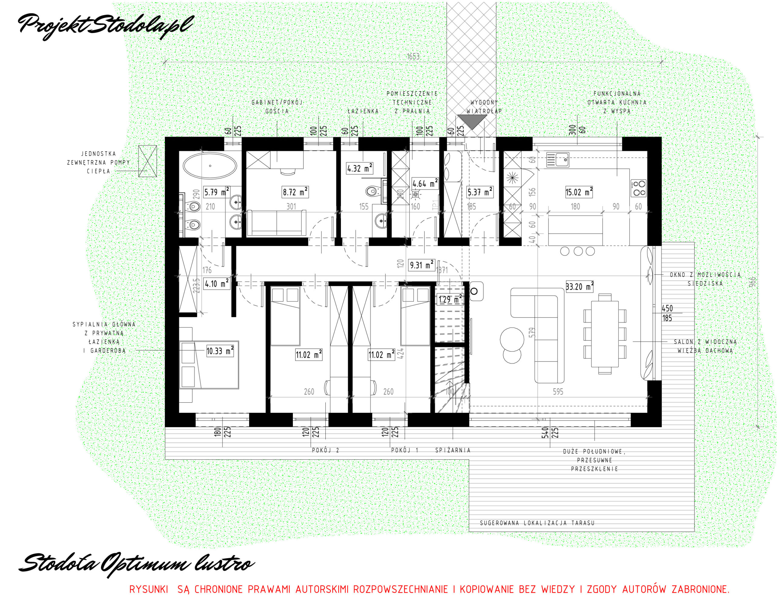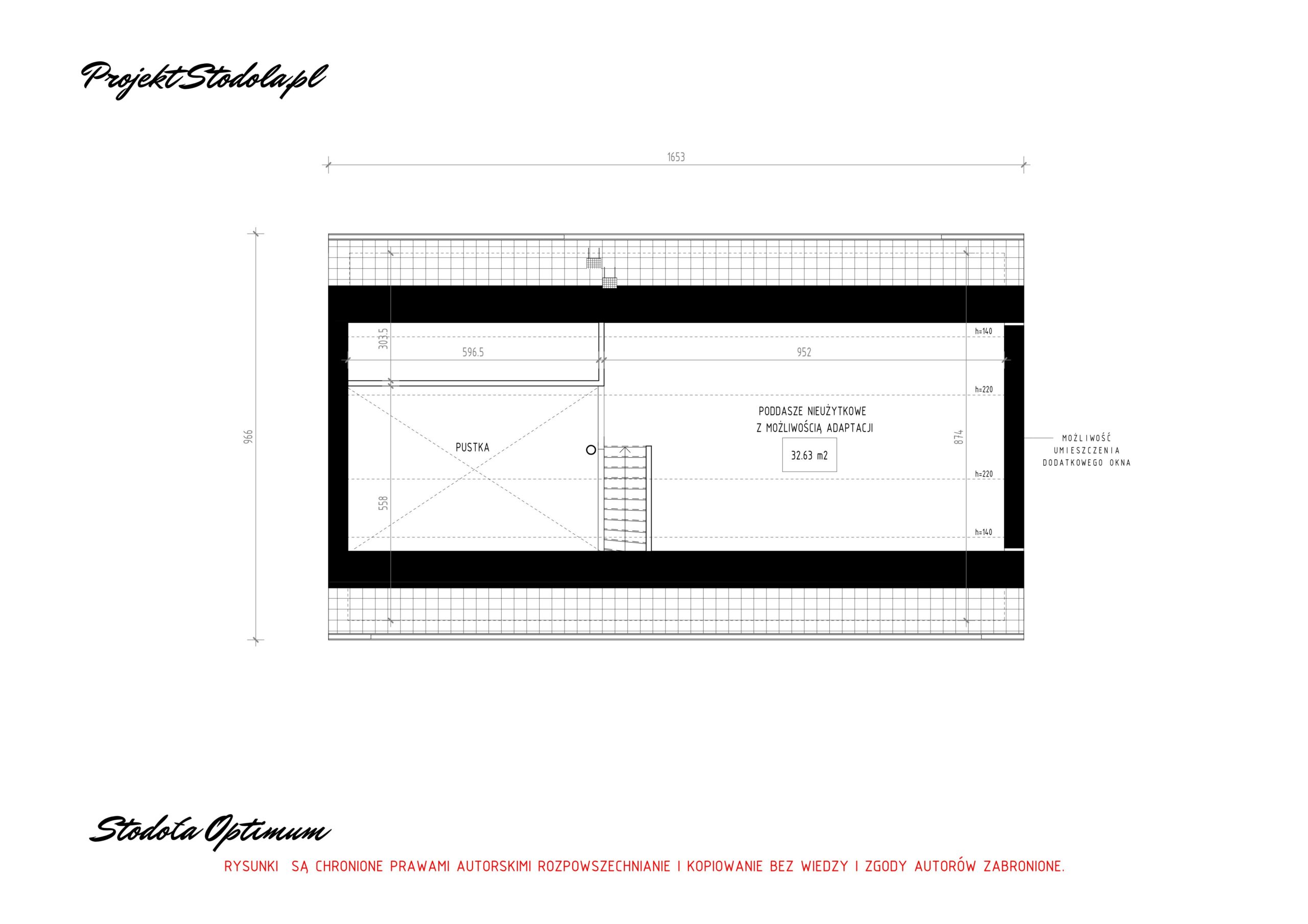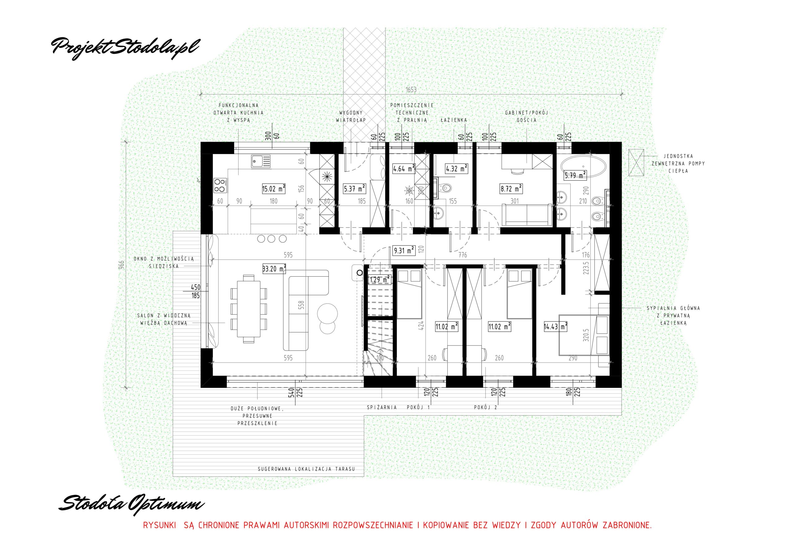 Stodoła Optimum to dom parterowy, ekonomiczny w budowie, zoptymalizowany pod katem funkcji, konstrukcji i energooszczędności. Posiada prosty, czytelny układ funkcjonalny. W strefie wejściowej znajduje się wygodny wiatrołap z miejscem na dużą szafę. Tuż obok usytuowano pomieszczenie techniczne. Całość rozplanowana jest na jednej osi komunikacyjnej zakończonej salonem z jadalnią oraz otwartą, naprawdę dużą kuchnią. Duże przeszklenia doświetlają  przestrzeń, powiększają ją optycznie i zapewniają połączenie wizualne z działką. W salonie zaprojektowano duże przeszklenie przesuwne typu HS oraz duże okno tzw. “poduszkowe”, z parapetem na wysokości 40cm, przy którym można zaaranżować ciekawie wygodne siedzisko. Z salonu można przejść schodami na poddasze (poddasze jest nieużytkowe, ale można je zaadaptować na cele mieszkalne). W przypadku braku adaptacji poddasza łatwo można zrezygnować ze schodów, zyskując metraż w salonie lub w sypialniach.