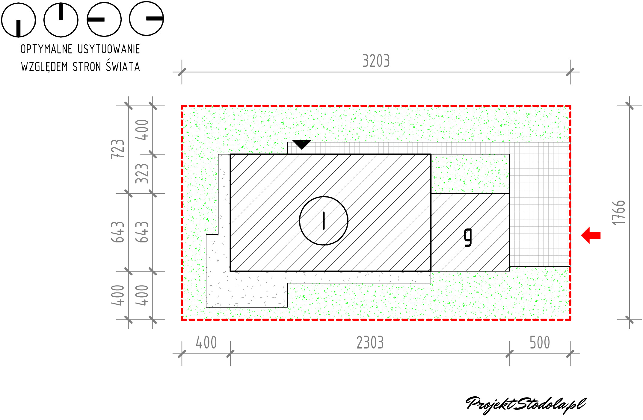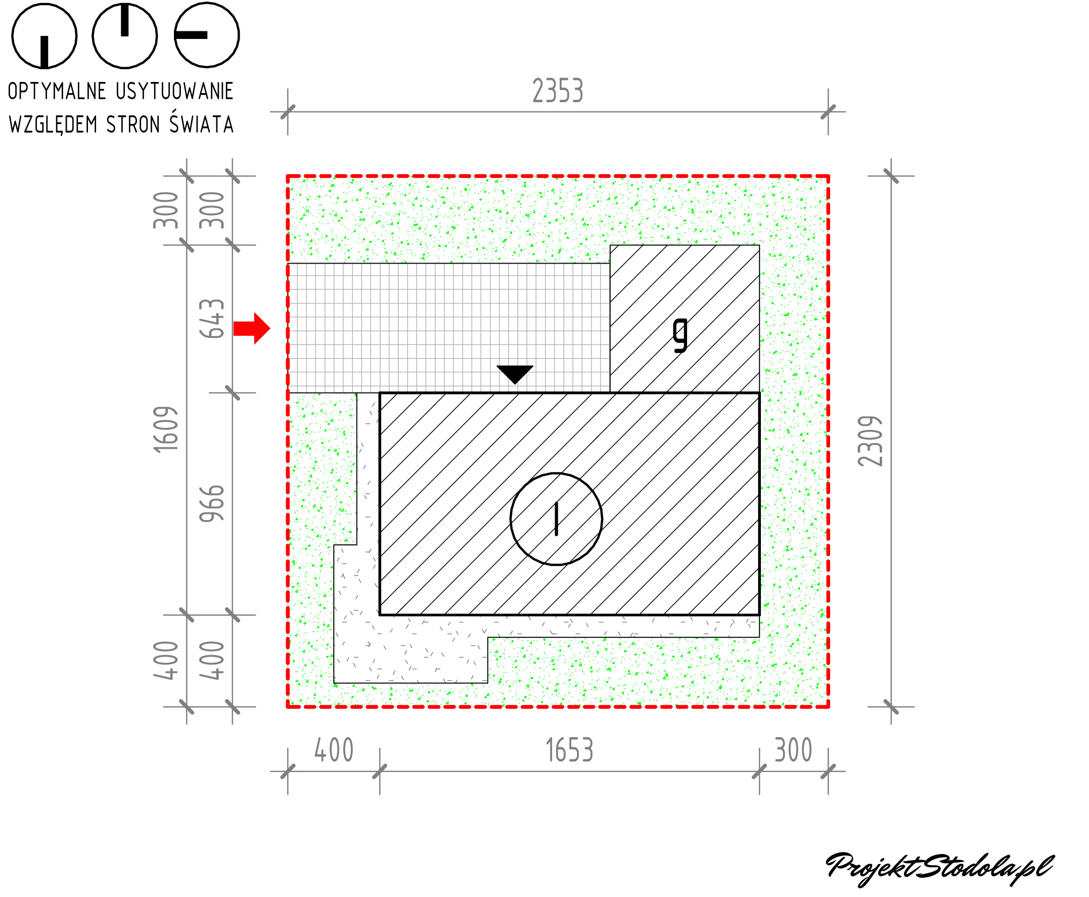 Najlepszym usytuowaniem jest wjazd od strony północnej działki, ale bardzo dobrze sprawdzi się również wjazd od strony wschodniej i zachodniej. Do budynku można dodać garaż (po delikatnej korekcie układu funkcjonalnego domu) jedno- lub dwustanowiskowy. Poniżej przedstawiamy różne warianty usytuowania na działce budynku z garażem lub bez.