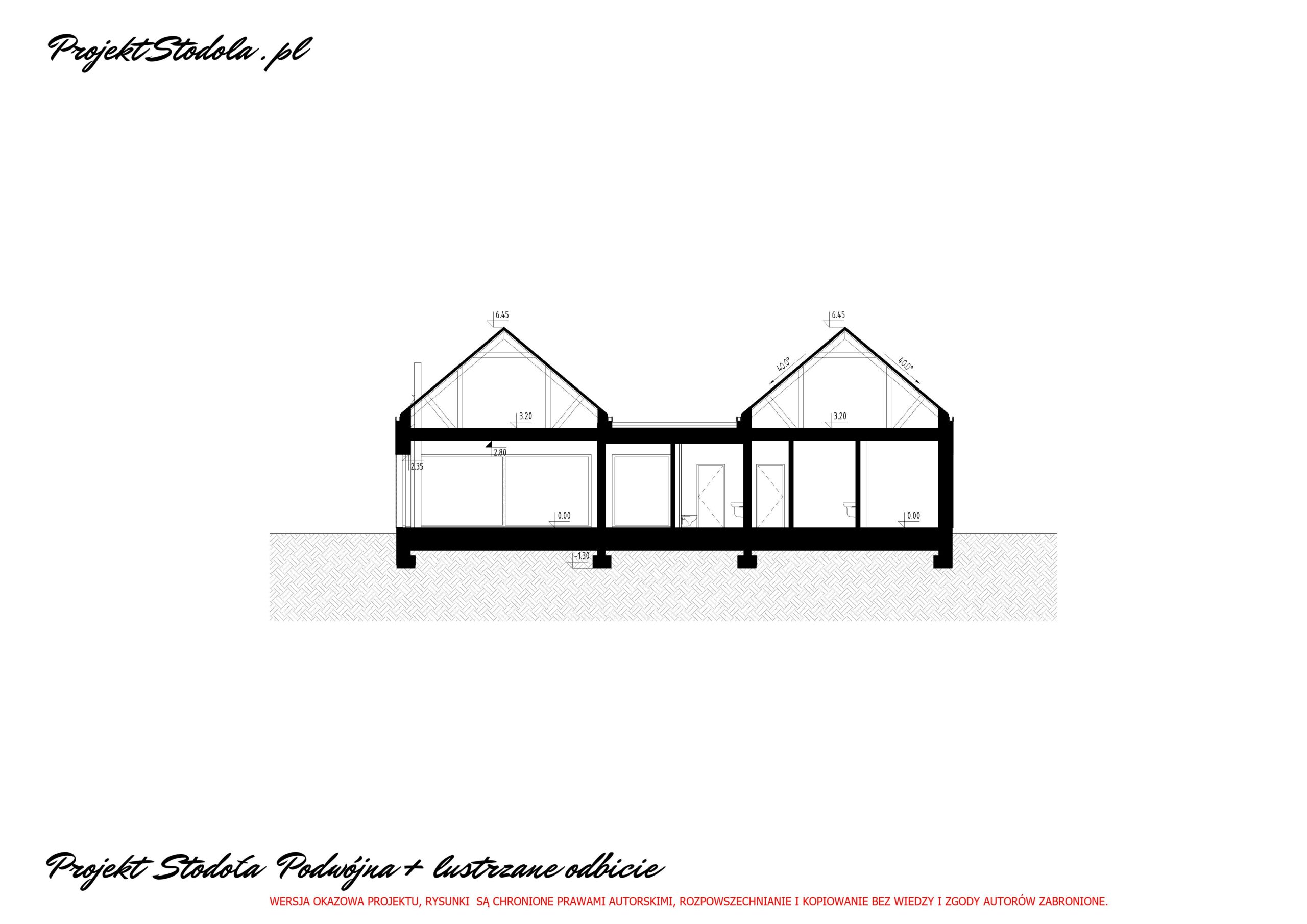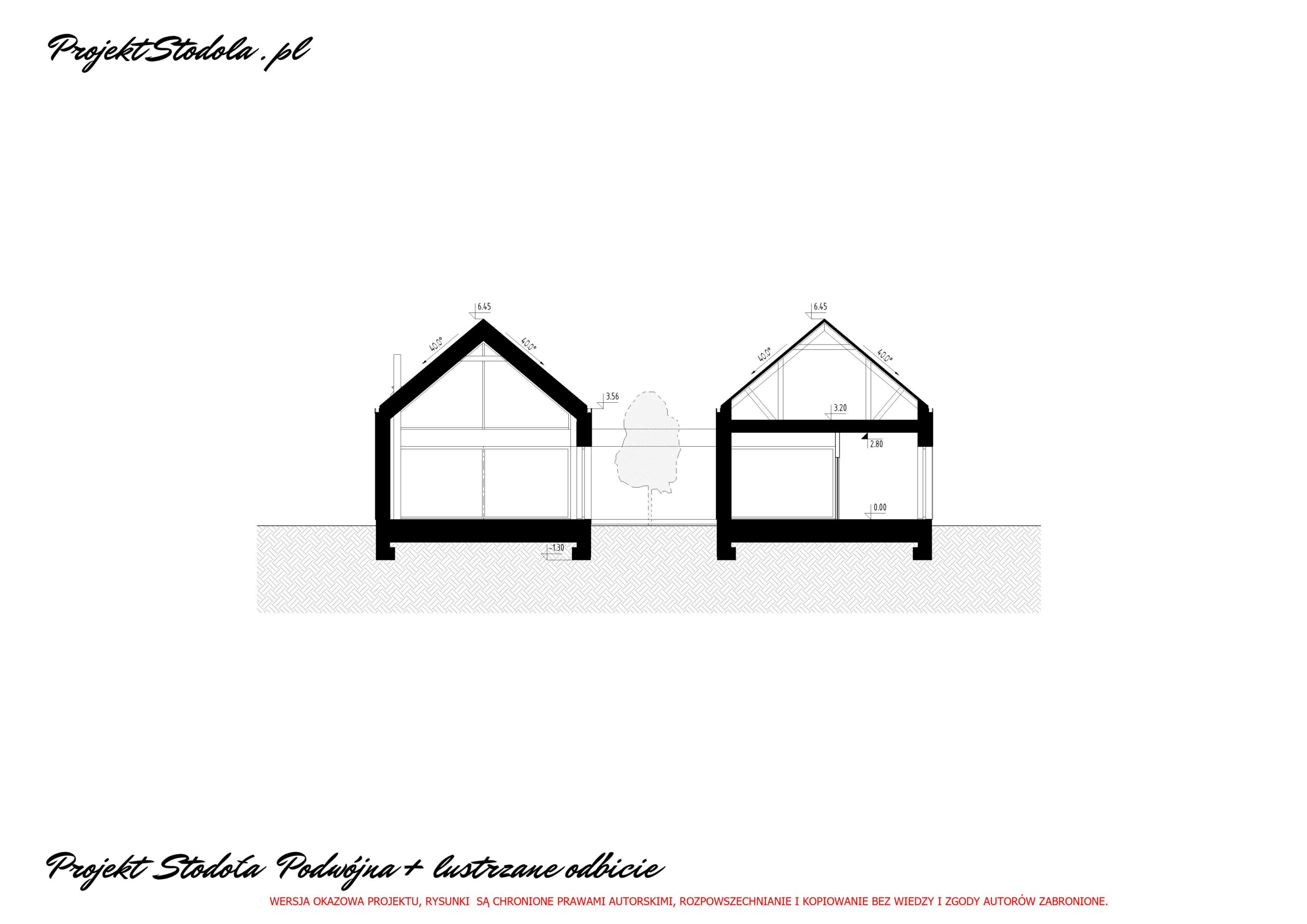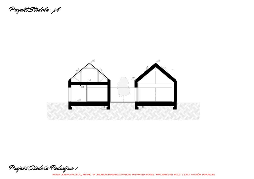 Prosty dom parterowy składający się z dwóch nowoczesnych stodół przykrytych dwuspadowymi, symetrycznymi dachami o kącie nachylenia 40 stopni. Dwie główne bryły połączone są łącznikiem przykrytym dachem płaskim. Budynek utrzymany w  minimalistycznej jednolitej stylistyce. Istnieje możliwość zaprojektowania tarasu na dachu łącznika lub dachu dwuspadowego w przypadku wymogów MPZP lub WZ)