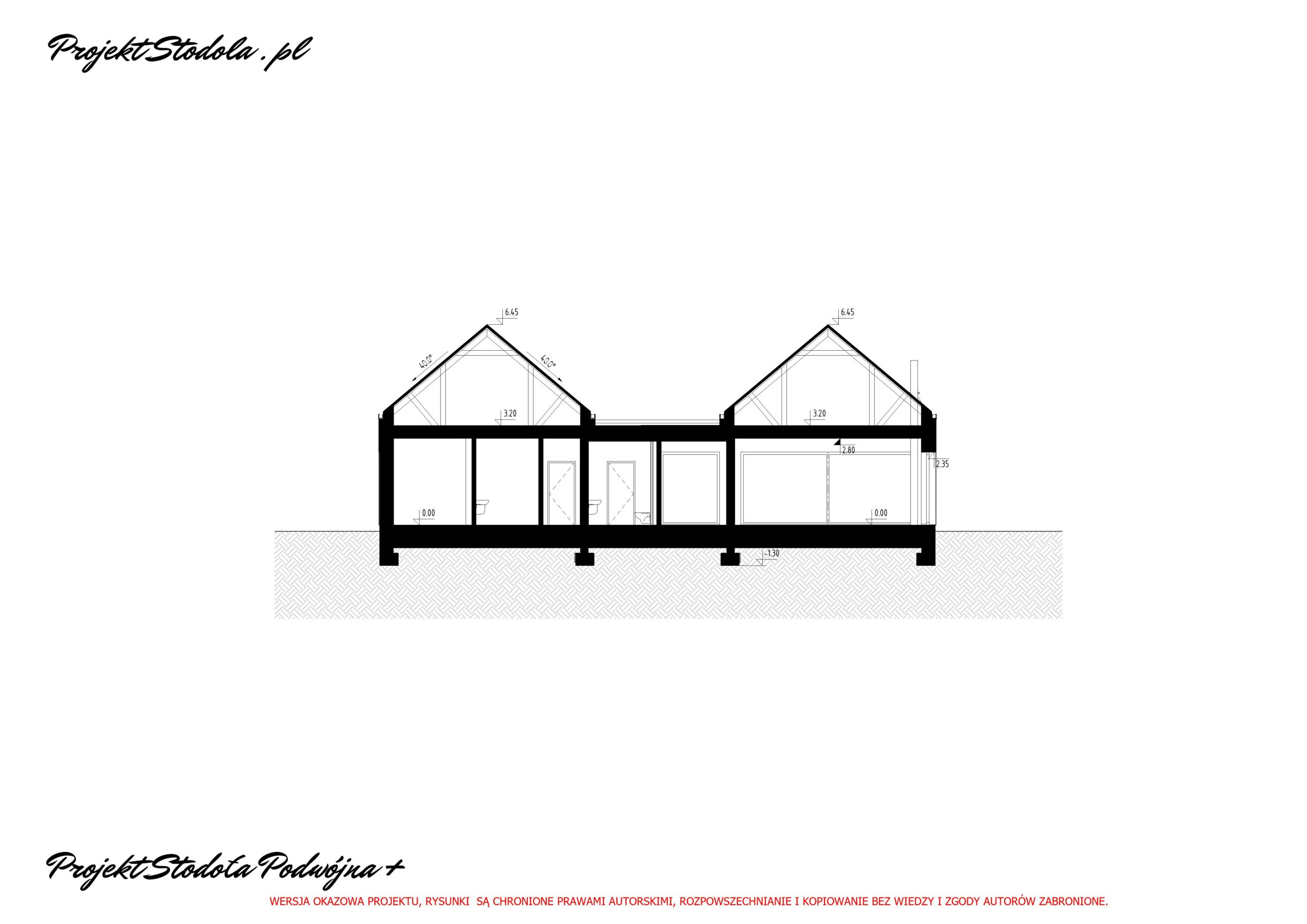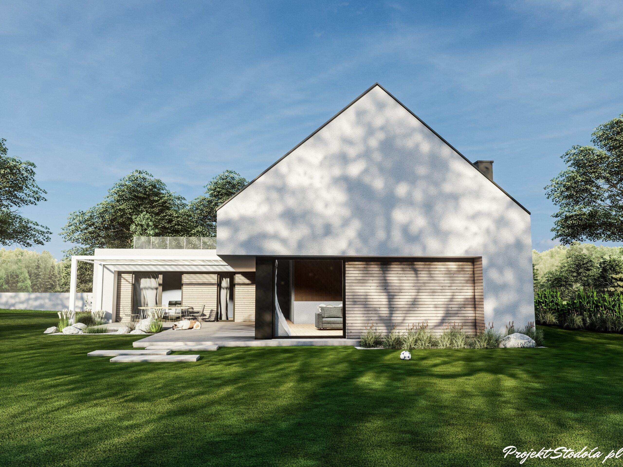 Prosty dom parterowy składający się z dwóch nowoczesnych stodół przykrytych dwuspadowymi, symetrycznymi dachami o kącie nachylenia 40 stopni. Dwie główne bryły połączone są łącznikiem przykrytym dachem płaskim. Budynek utrzymany w  minimalistycznej jednolitej stylistyce. Istnieje możliwość zaprojektowania tarasu na dachu łącznika lub dachu dwuspadowego w przypadku wymogów MPZP lub WZ)