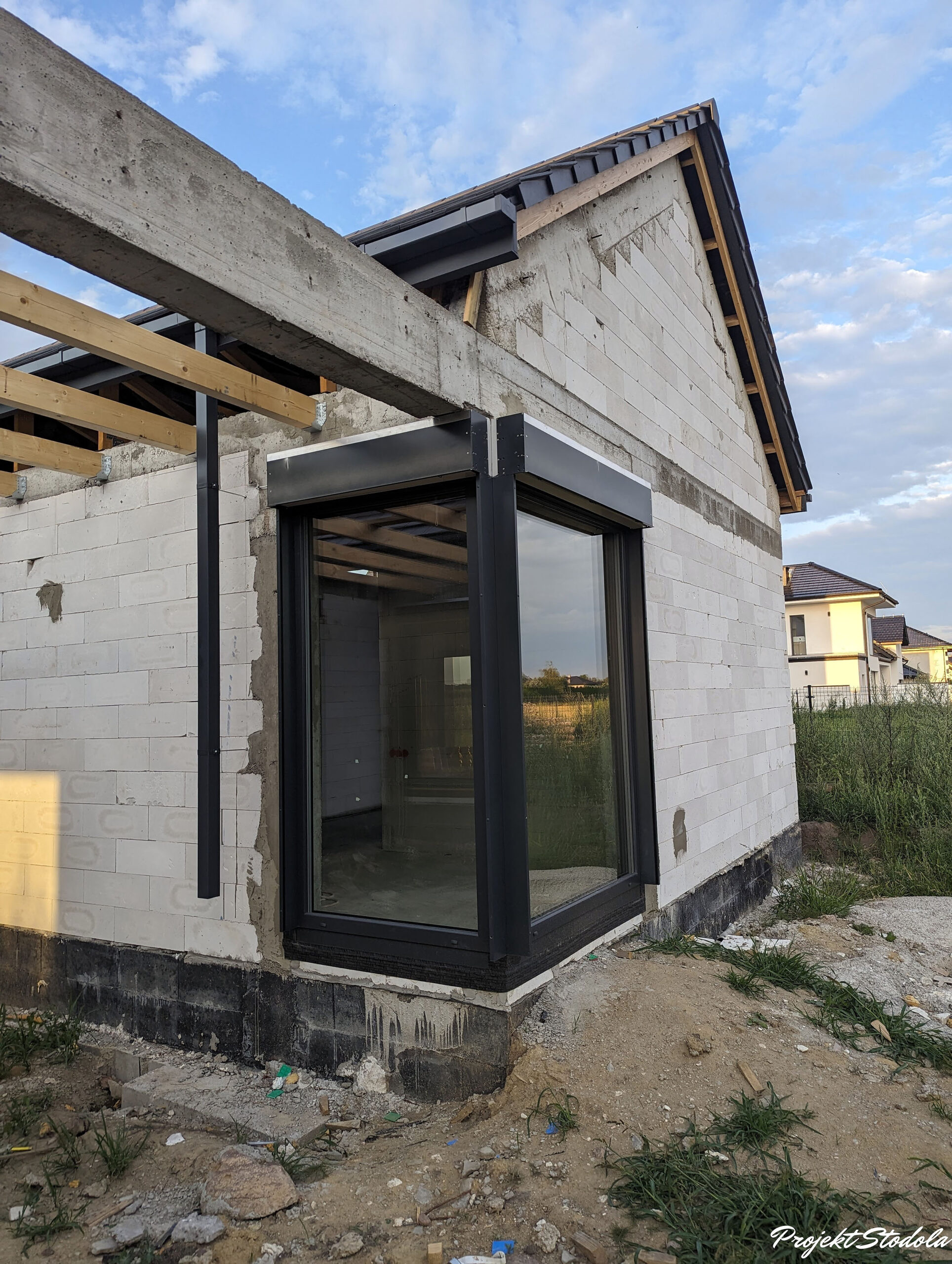 Elementem charakterystycznym, kontrastującym z stonowaną prostopadłościenną formą jest duże, trójkątne przeszklenie z zadaszone dachem  od strony tylnej ściany szczytowej. Przeszklenie doświetla otwartą przestrzeń salonu. Wysunięty dach ogranicza penetrację promieni słonecznych oraz tworzy częściowe zadaszenie nad tarasem.