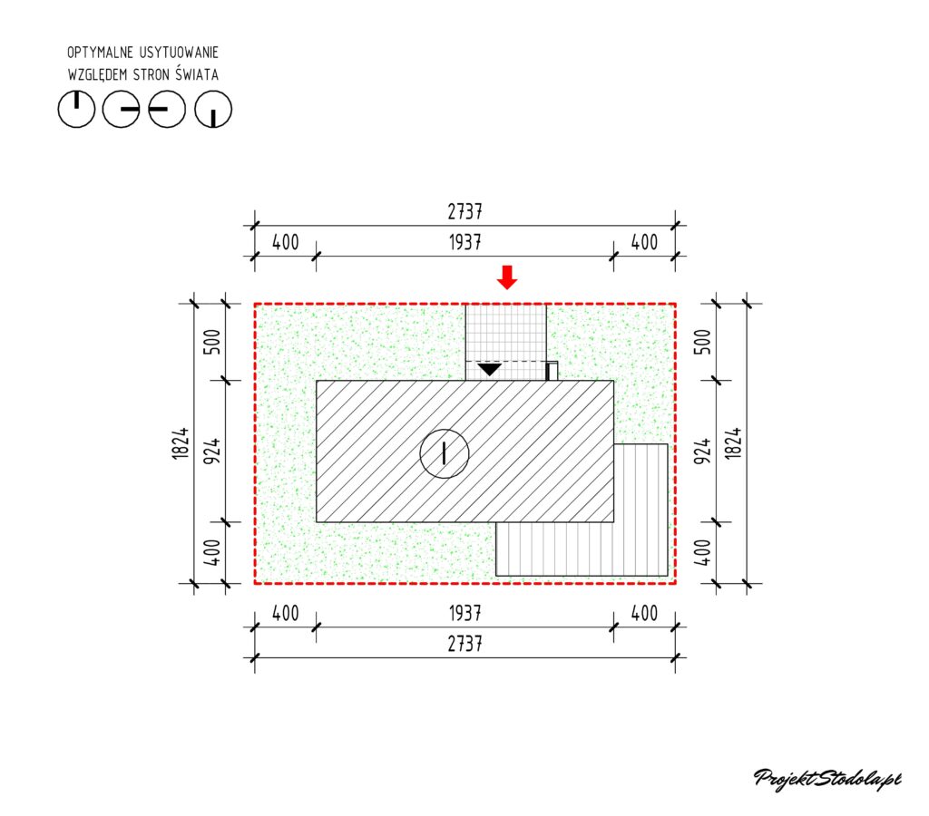 Projekt bazowy dopasowany jest do działek z widokiem od strony tylnej lub bocznej elewacji. Urbanistycznie budynek można dopasować praktycznie do każdej działki, której wymiary pozwalają na jego usytuowanie.