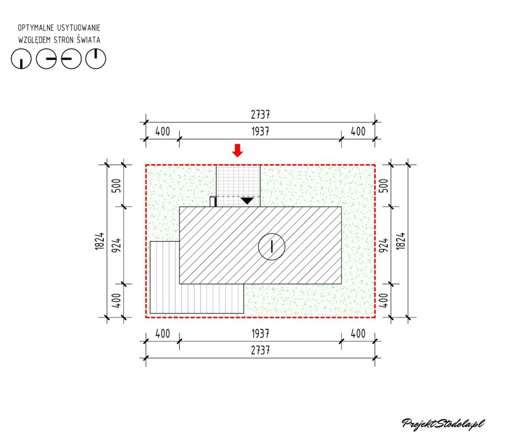 - Wariant 1 – z wjazdem od boku min. wymiary działki 27,37 x 18,24 cm