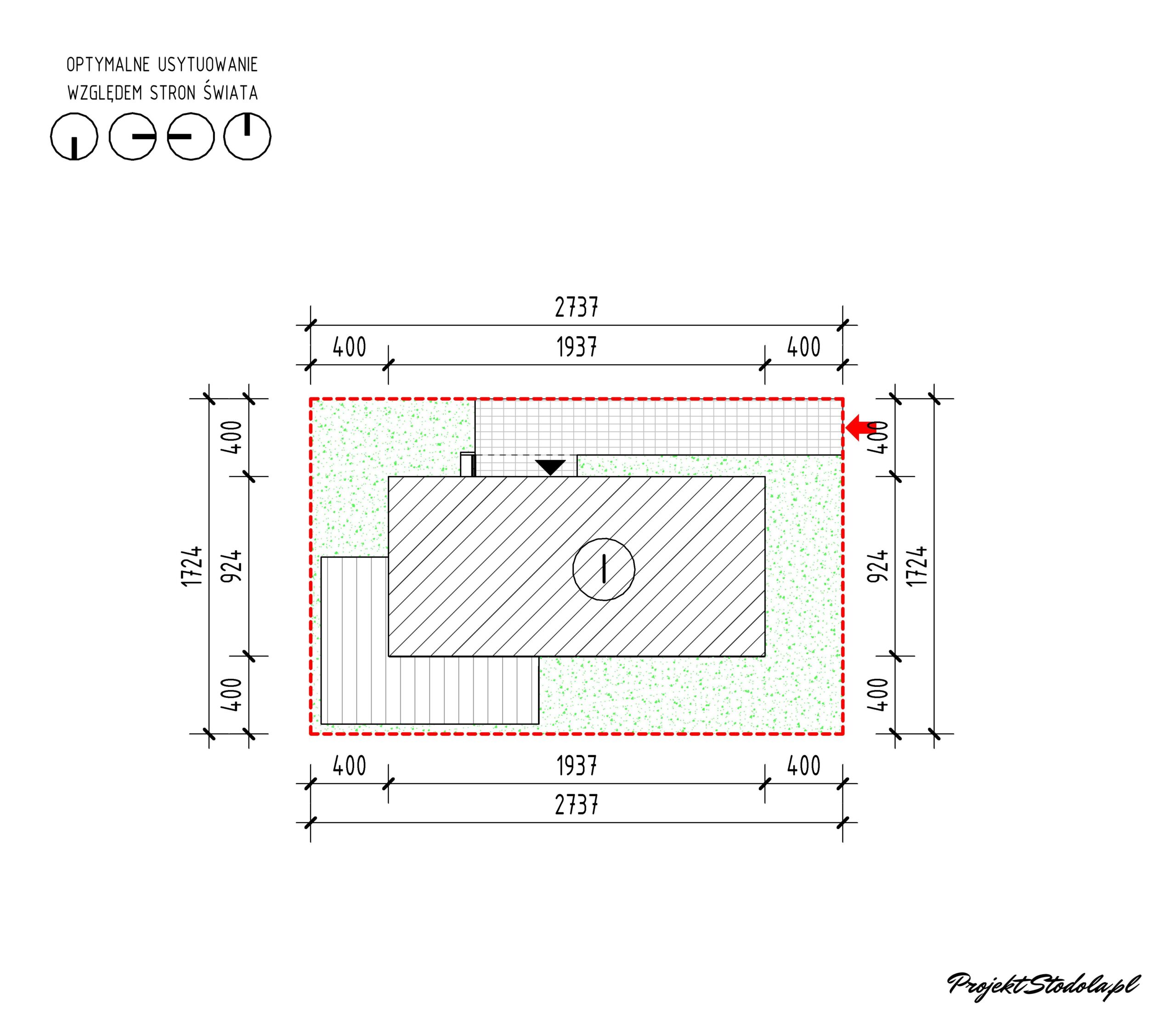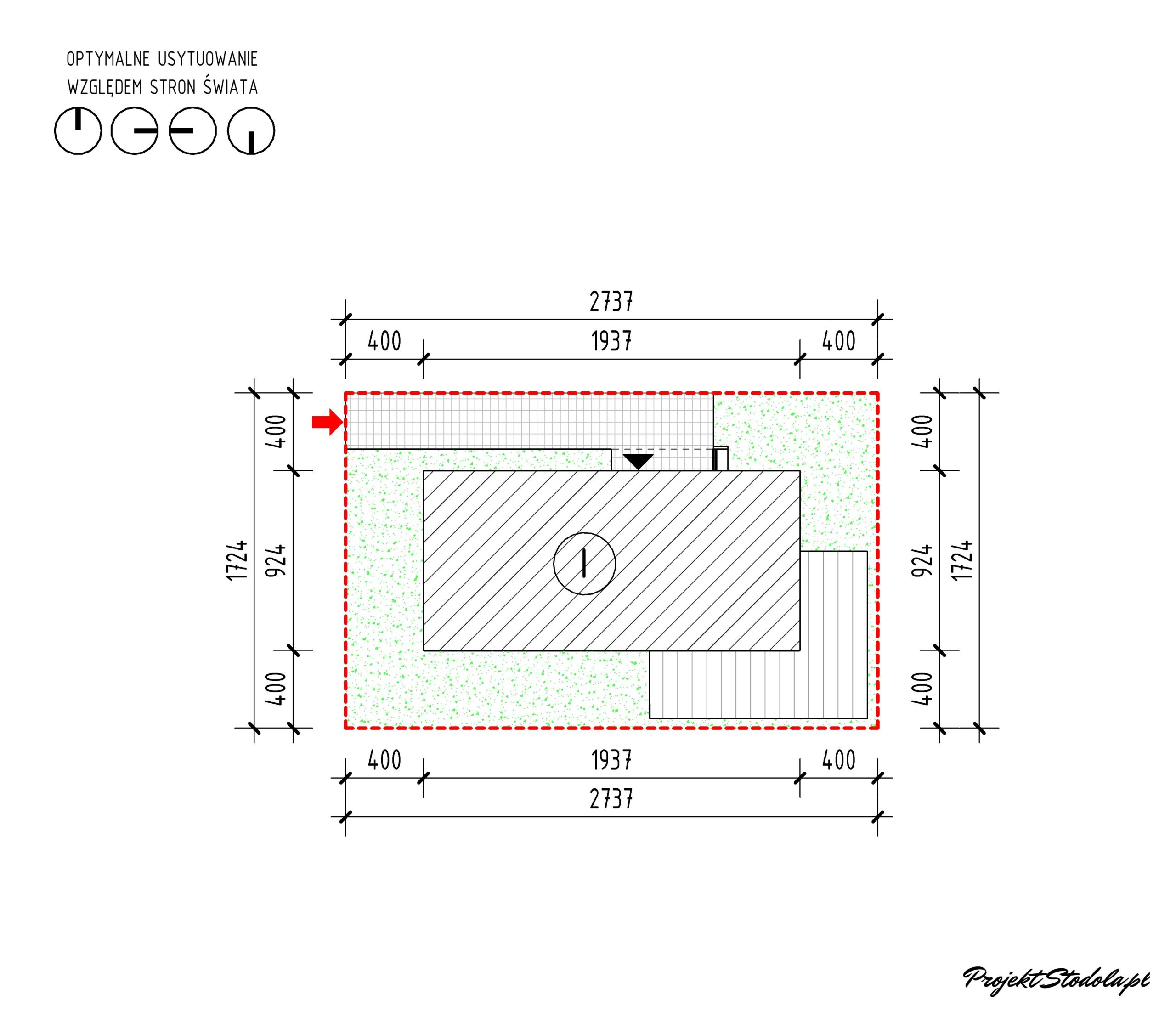 Z uwagi na kompaktowy kształt budynek można usytuować na działce w kilku wariatach.