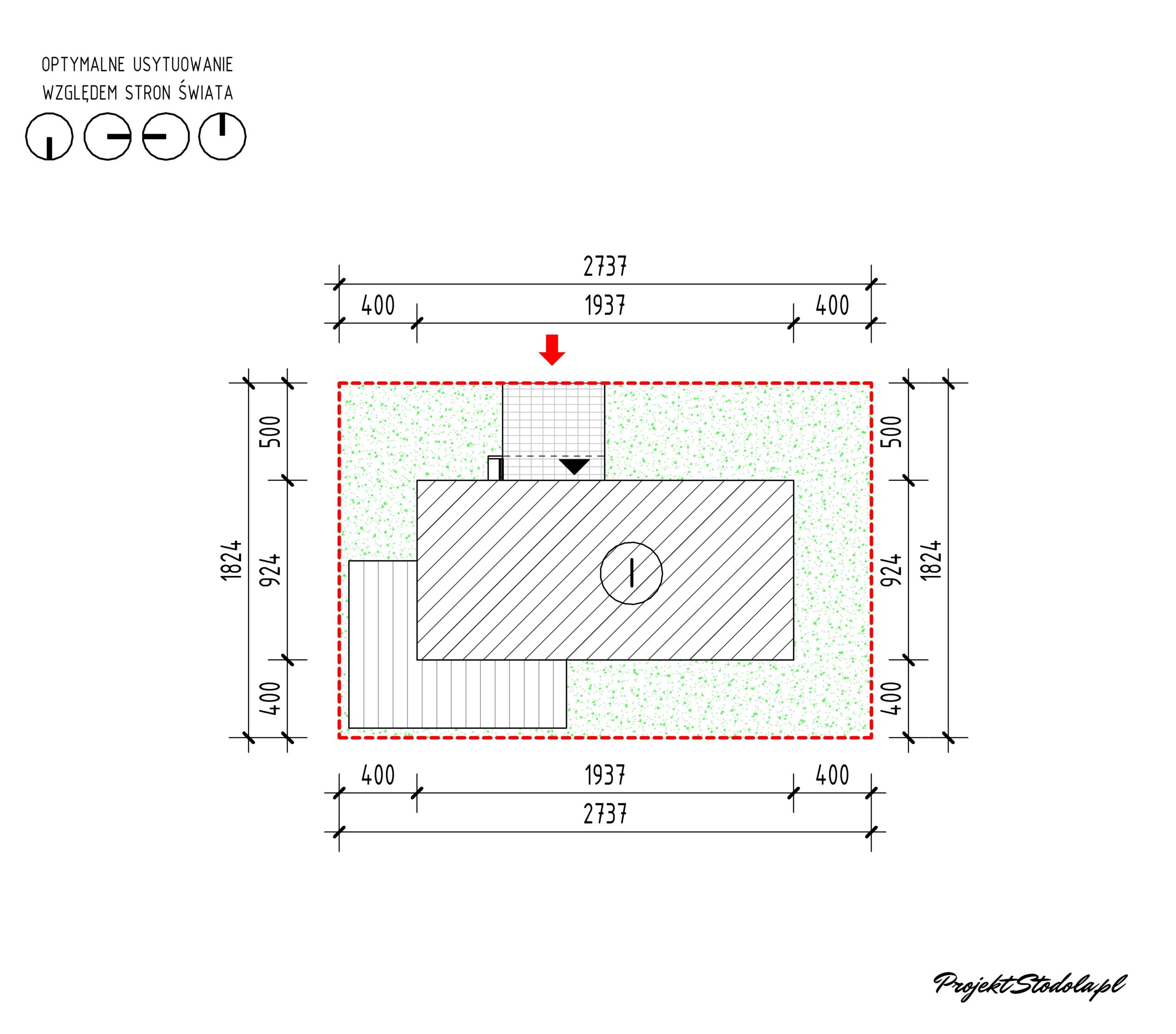 Projekt bazowy dopasowany jest do działek z widokiem od strony tylnej lub bocznej elewacji. Urbanistycznie budynek można dopasować praktycznie do każdej działki, której wymiary pozwalają na jego usytuowanie.