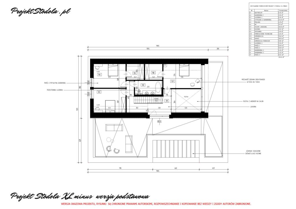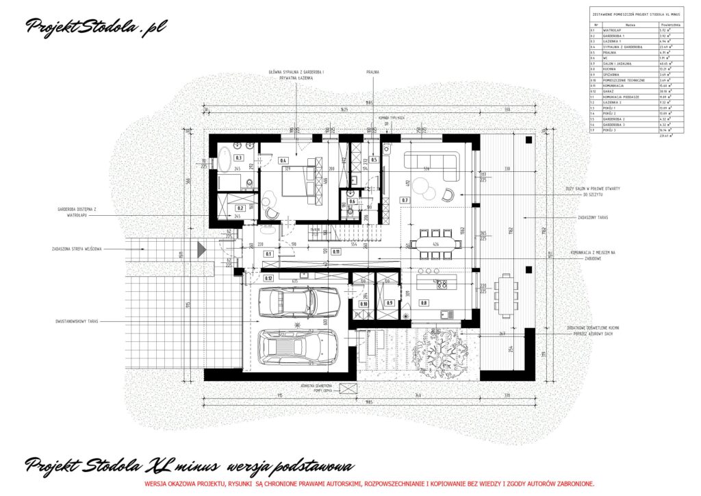 Stodoła XL Minus  231,61 m2 powierzchni użytkowej. Projekt został starannie rozplanowany, aby zapewnić zarówno funkcjonalność, wyogdę jak i efekt “wow”. Pomieszczenia dziennego użytku, takie jak jadalnia, salon i kuchnia, zostały umiejscowione od strony ogrodu z dużym przeszkleniem zapewniając harmonijne połączenie z przestrzenią zewnętrzną. Na całej długości tej stredy znajduje się zadaszony taras. W strefie wejściowej znajduje się wygodny wiatrołap, który bezpośrednio łączy się z garderobą i dwustanowiskowym garażem. Po przejściu wiatrołapu, znajdujemy się w przestronnej komunikacji, gdzie wyróżniają się eksponowane schody prowadzące na poddasze. Z tej strefy dostępna jest także zlokalizowana na parterze sypialnia master, pralnia oraz wc. Komunikacja jest na tyle przestronna, że pozwala na całej jej długości, na zlokalizowanie zabudowy do przechowywania. Całość przestrzeni została zaplanowana wzdłuż jednej osi komunikacyjnej, zakończonej dużym salonem z imponującym przeszkleniem, które otwiera widok na działkę i zadaszony taras.