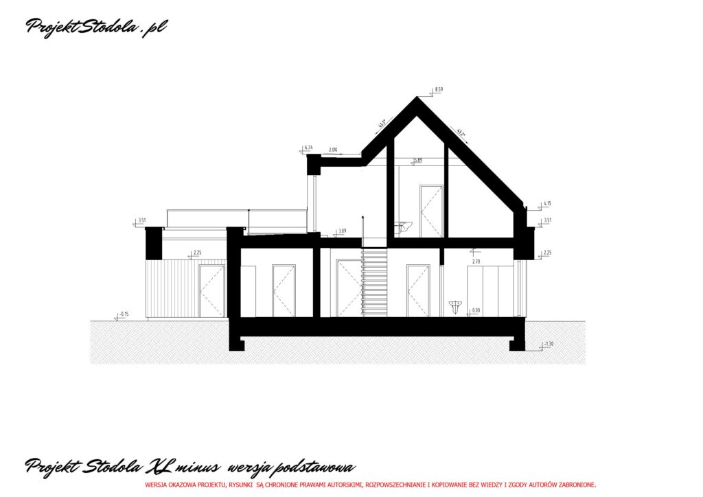 Projekt Stodoła XL Minus – to mniejsza wersja największego projektu w naszej kolekcji, łącząc funkcjonalność, wygodę i niepowtarzalną estetykę w duchu nowoczesnej stodoły, bez kompromisów. Zachowuje wszystkie cechy niezbędne, aby dom był nie tylko energooszczędny, ale także łatwy w budowie. Budynek charakteryzuje się prostym układem brył, składającym się z dwóch przesuniętych prostokątów. Elewacja budynku prezentuje się prosto i elegancko, wykorzystując materiały premium takie jak ciemny tynk, łupek i drewno, które podkreślają jej charakter premium. Strefa wejściowa jest zadaszona,udynek posiada również zadaszony taras.