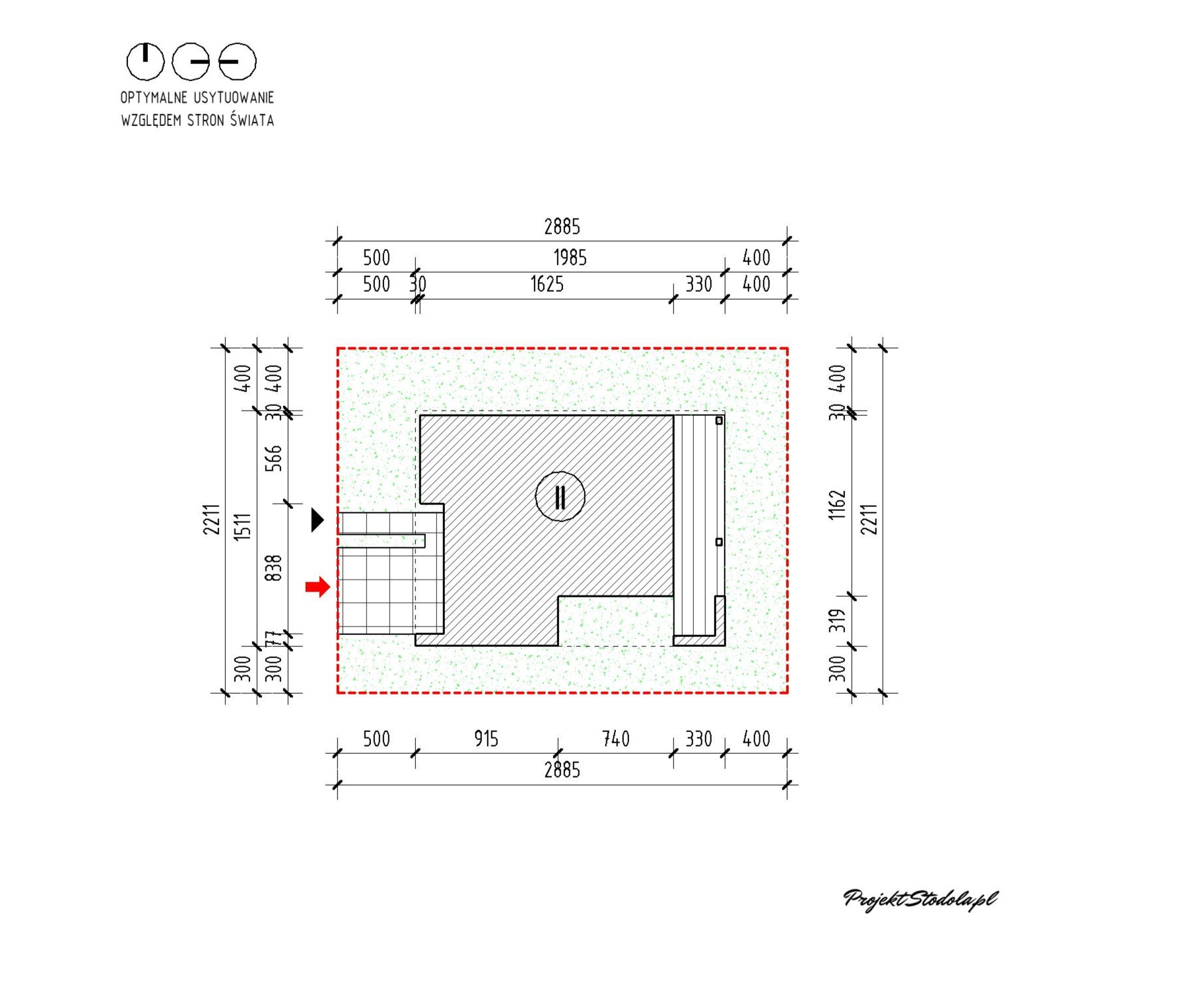 Budynek można usytuować w kilku wariantach. Podstawowy wariant jest przy rekomendowanym wjeździe od strony wschodniej, zachodniej oraz północnej  (Wariant 1 ).