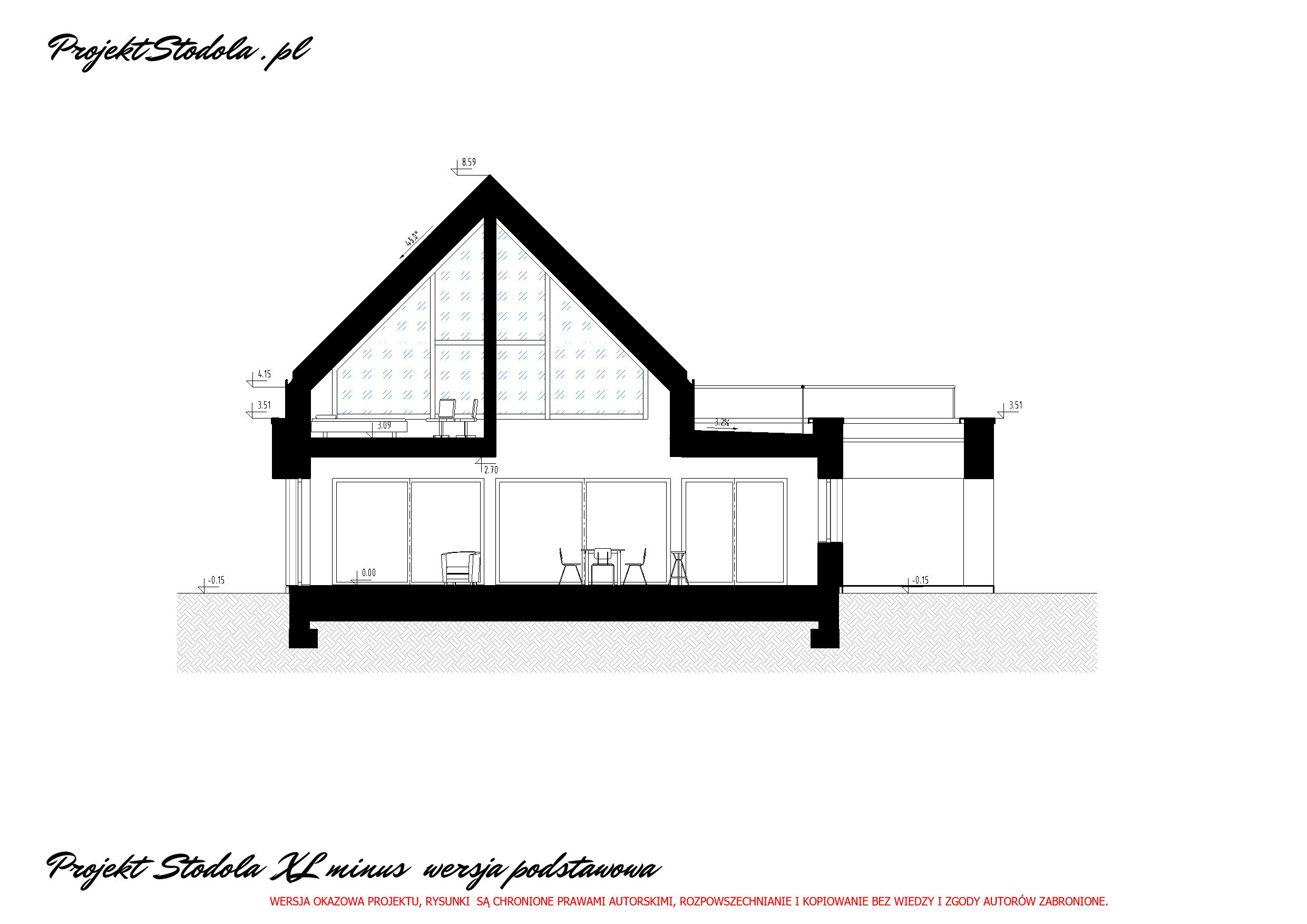 Stodoła XL Minus  231,61 m2 powierzchni użytkowej. Projekt został starannie rozplanowany, aby zapewnić zarówno funkcjonalność, wyogdę jak i efekt “wow”. Pomieszczenia dziennego użytku, takie jak jadalnia, salon i kuchnia, zostały umiejscowione od strony ogrodu z dużym przeszkleniem zapewniając harmonijne połączenie z przestrzenią zewnętrzną. Na całej długości tej stredy znajduje się zadaszony taras. W strefie wejściowej znajduje się wygodny wiatrołap, który bezpośrednio łączy się z garderobą i dwustanowiskowym garażem. Po przejściu wiatrołapu, znajdujemy się w przestronnej komunikacji, gdzie wyróżniają się eksponowane schody prowadzące na poddasze. Z tej strefy dostępna jest także zlokalizowana na parterze sypialnia master, pralnia oraz wc. Komunikacja jest na tyle przestronna, że pozwala na całej jej długości, na zlokalizowanie zabudowy do przechowywania. Całość przestrzeni została zaplanowana wzdłuż jednej osi komunikacyjnej, zakończonej dużym salonem z imponującym przeszkleniem, które otwiera widok na działkę i zadaszony taras.